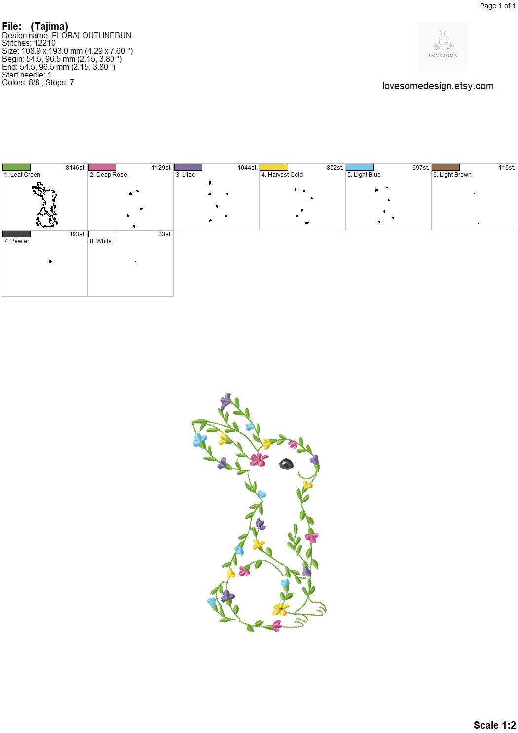 This listing features a machine embroidery file of floral outline rabbit in 8 inch size.