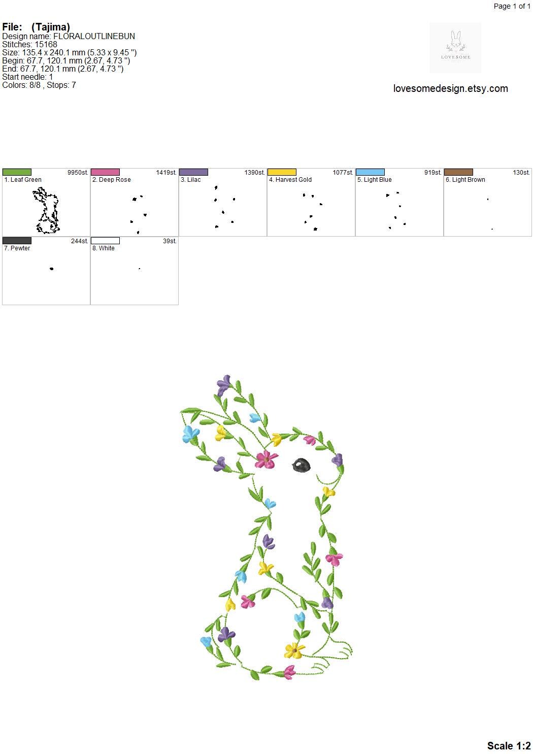 This listing features a machine embroidery file of floral outline rabbit in 10 inch size.