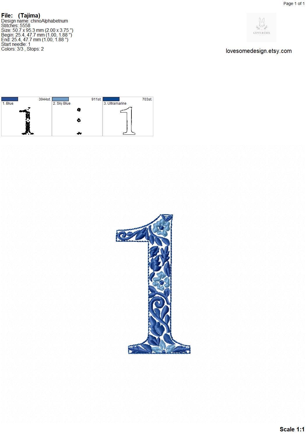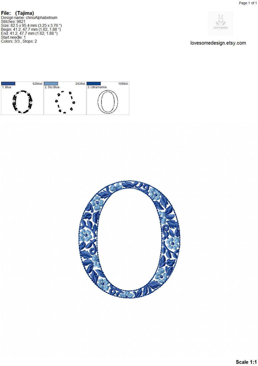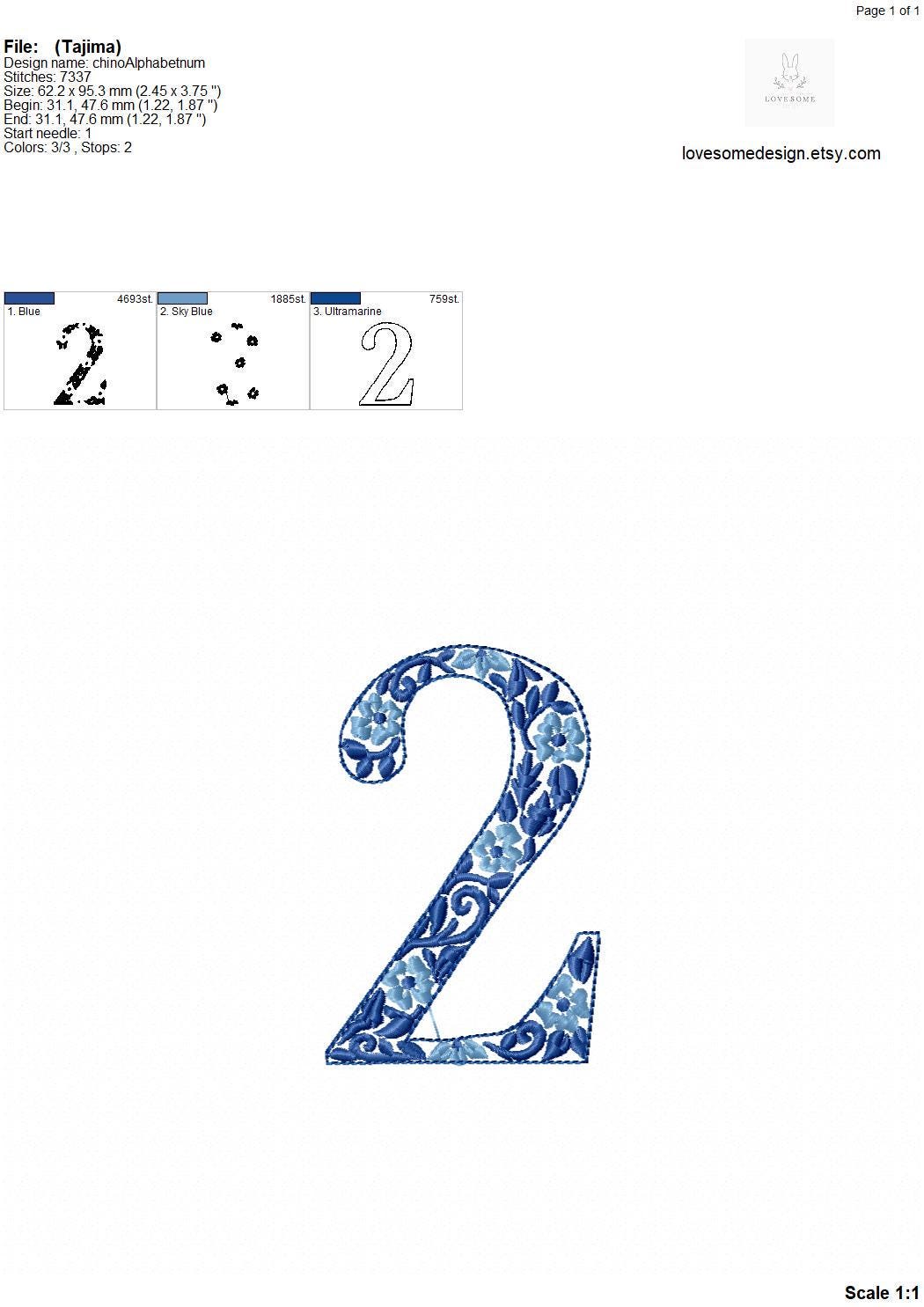 This listing features a machine embroidery font set which includes embroidery files of 10 chinoiserie numbers 0-9 in blue white colors in 4inch size. For the whole set, pls see the listing images.