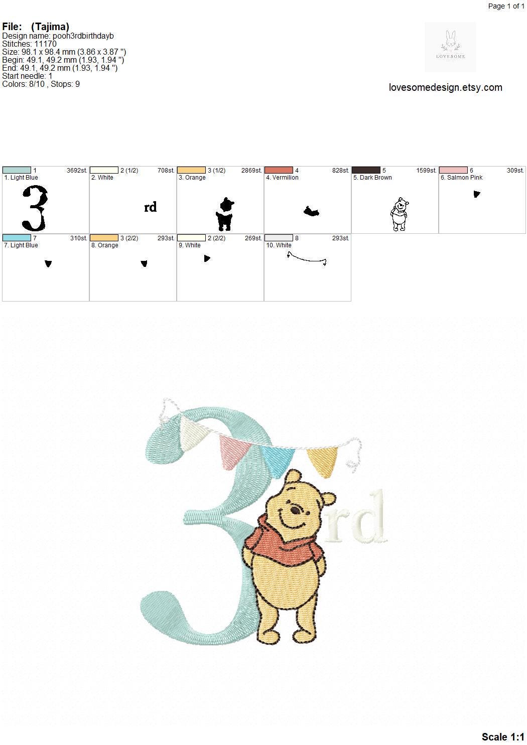 This listing features a machine embroidery file of Winnie the Pooh 3rd Birthday design. Designed with love for the third birthday of the little one.