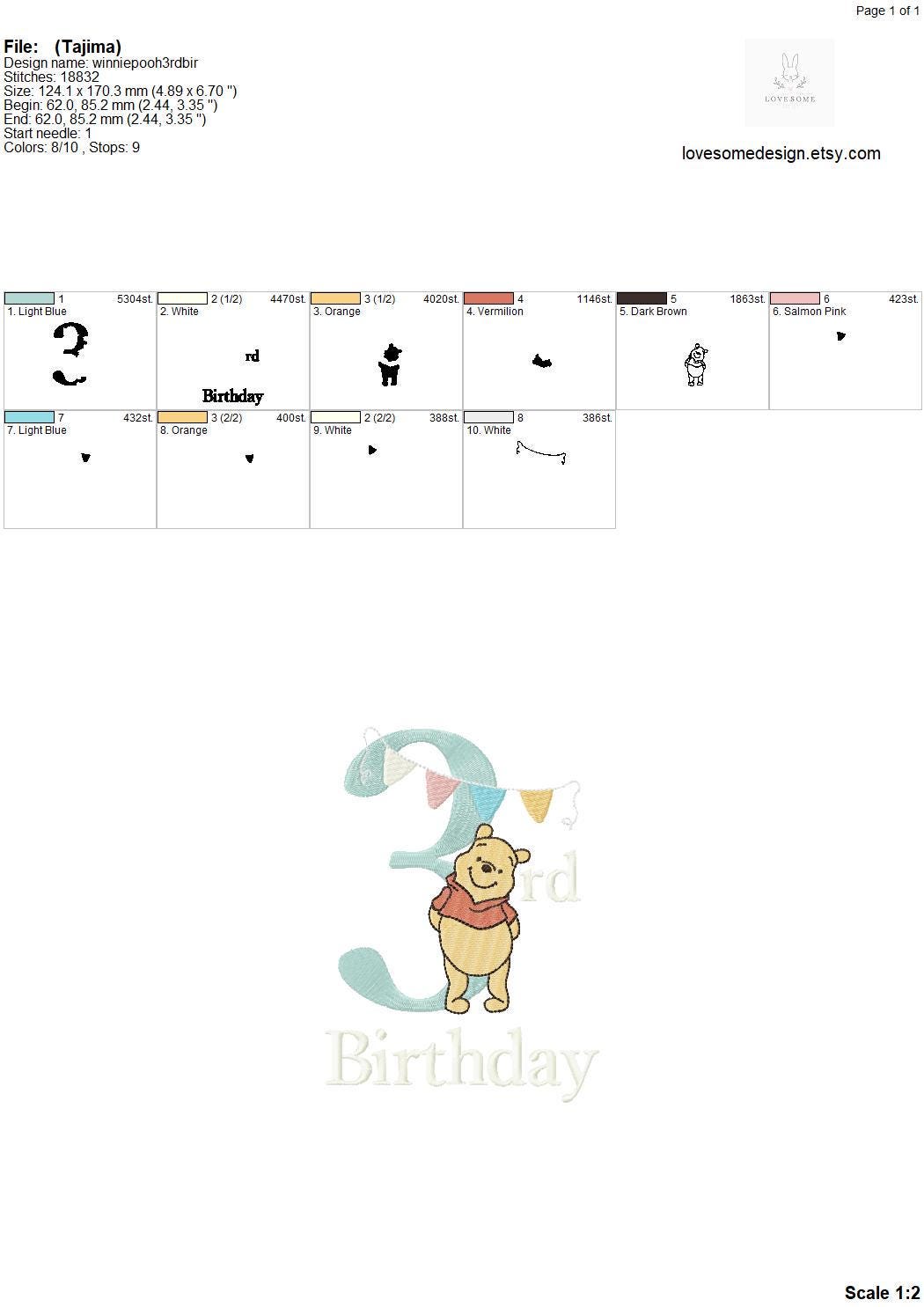 This listing features a machine embroidery file of Winnie the Pooh 3rd Birthday design. Designed with love for the third birthday of the little one.