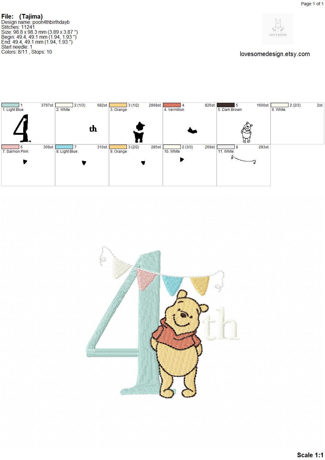 This listing features a machine embroidery file of Winnie the Pooh 4th Birthday design. Designed with love for the fourth birthday of the little one.