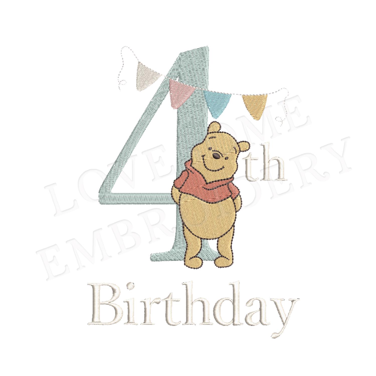 Pooh Bear Fourth Birthday 4x4 Machine Embroidery Design Digital Download | Lovesome Design