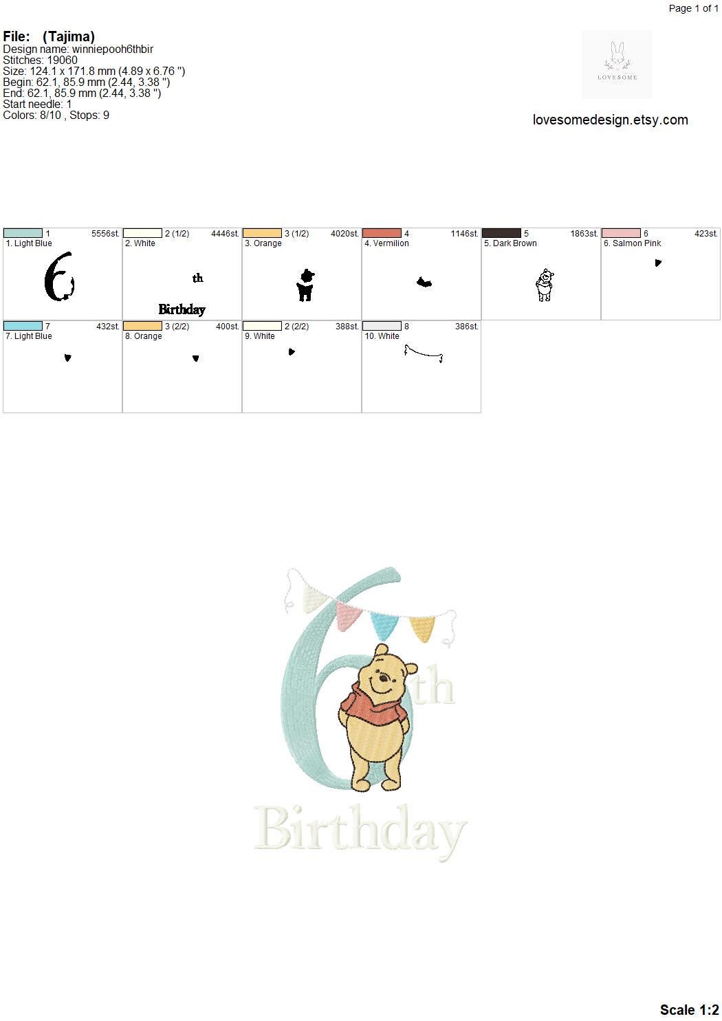 This listing features a machine embroidery file of Winnie the Pooh 6th Birthday design. Designed with love for the sixth birthday of the little one.