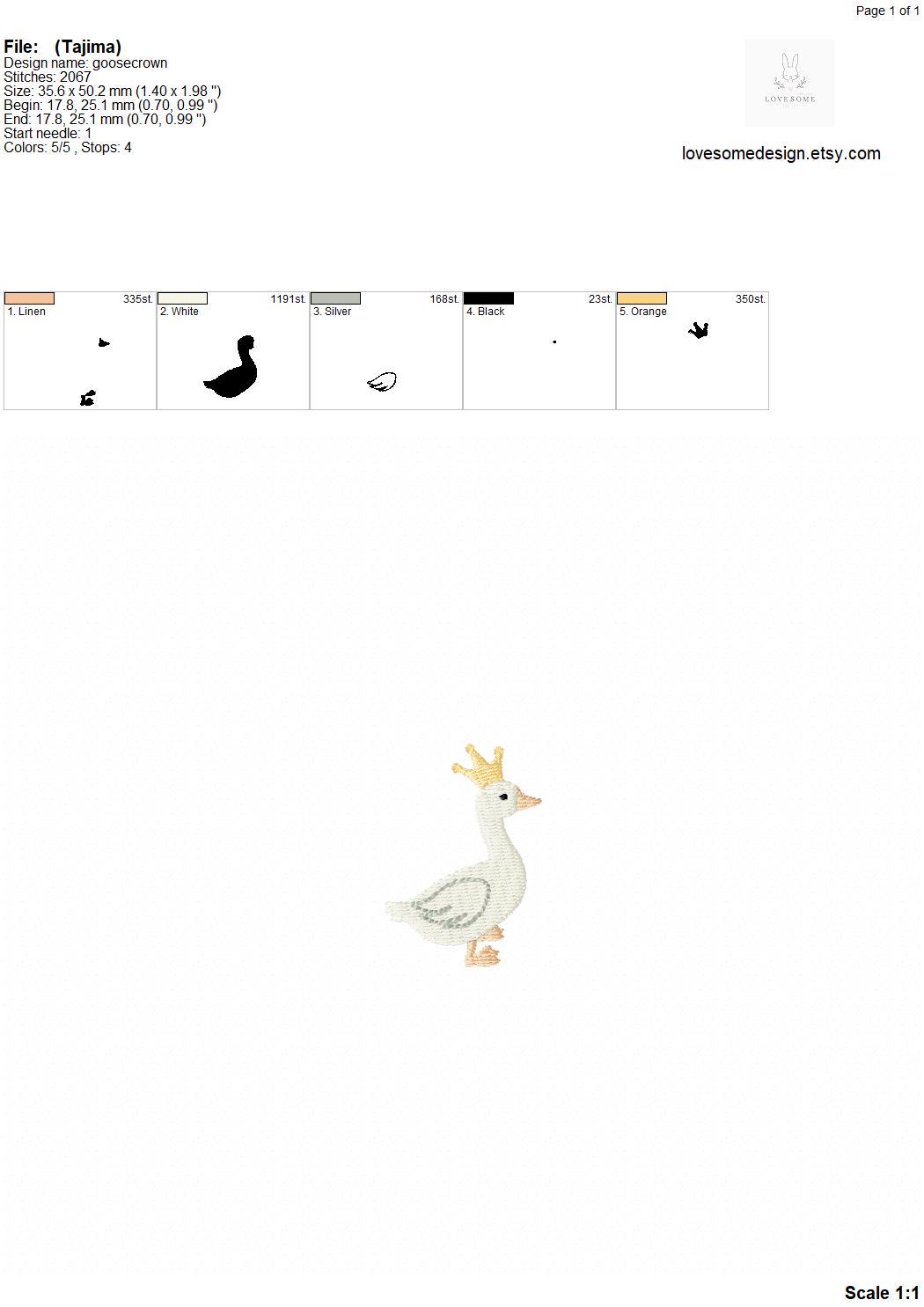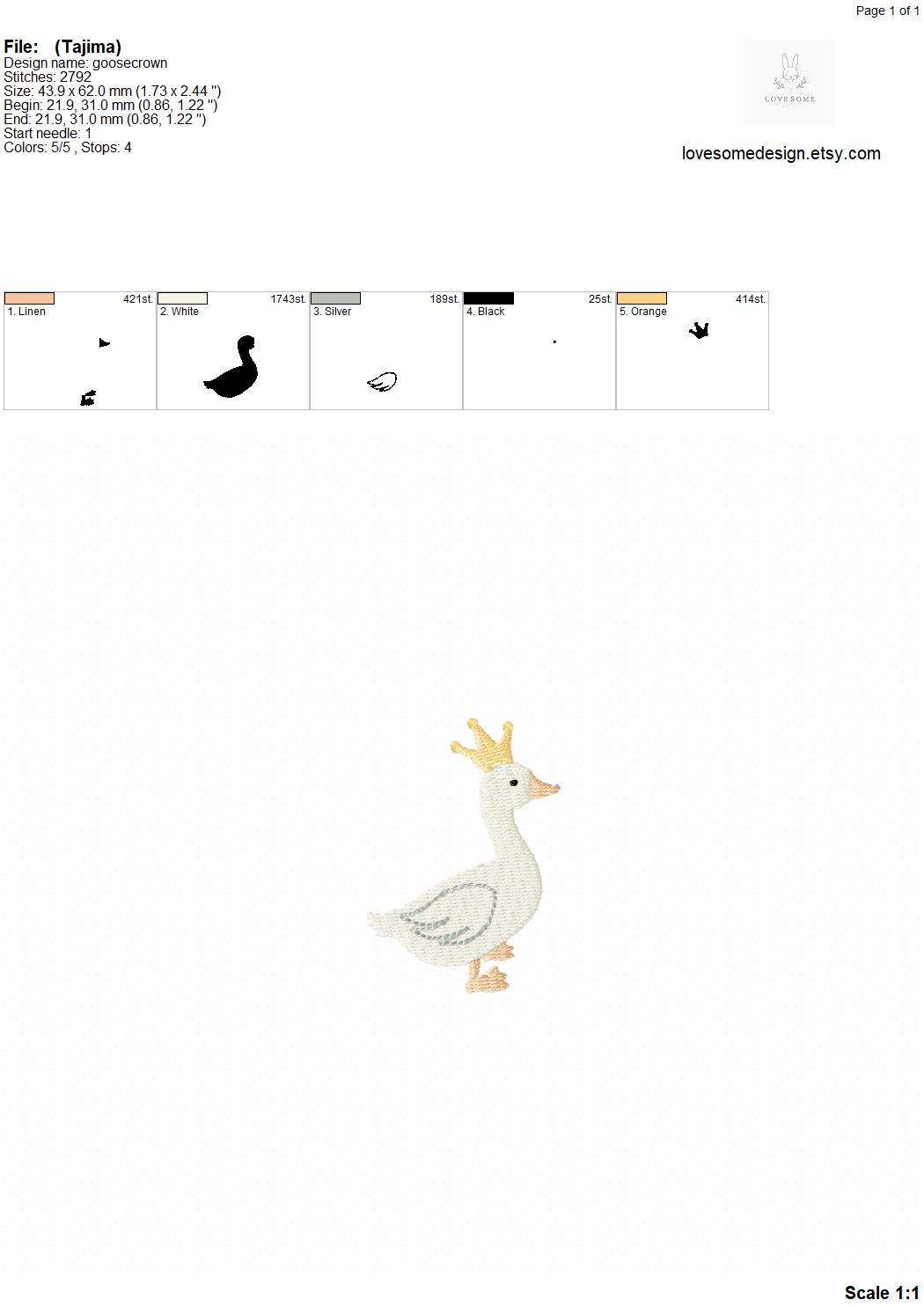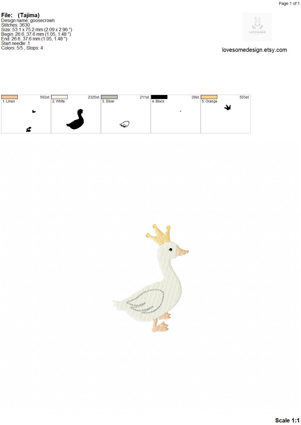 This listing includes one cute king goose with a crown design for machine embroidery in three mini sizes, each appr. in 2inch, 2.5inch and 3inch size for embroidery hoops in different sizes.