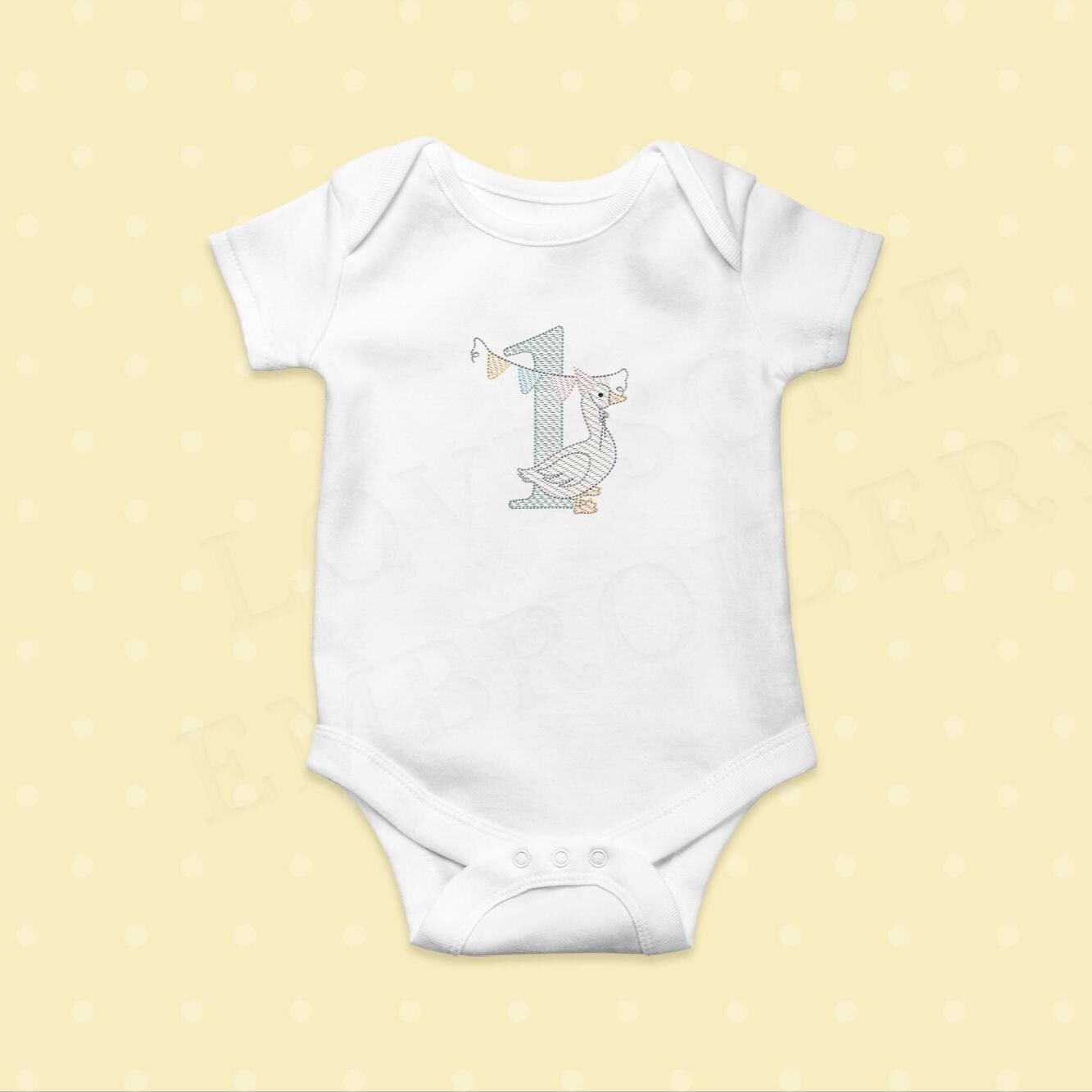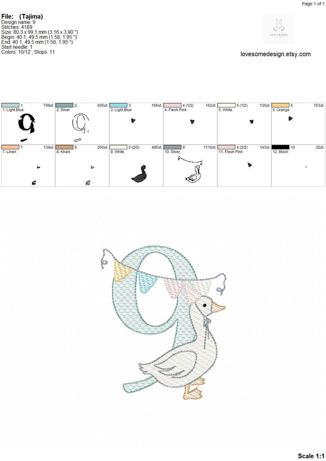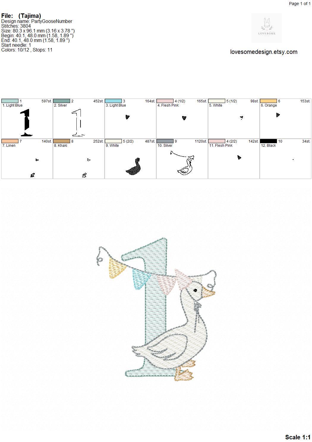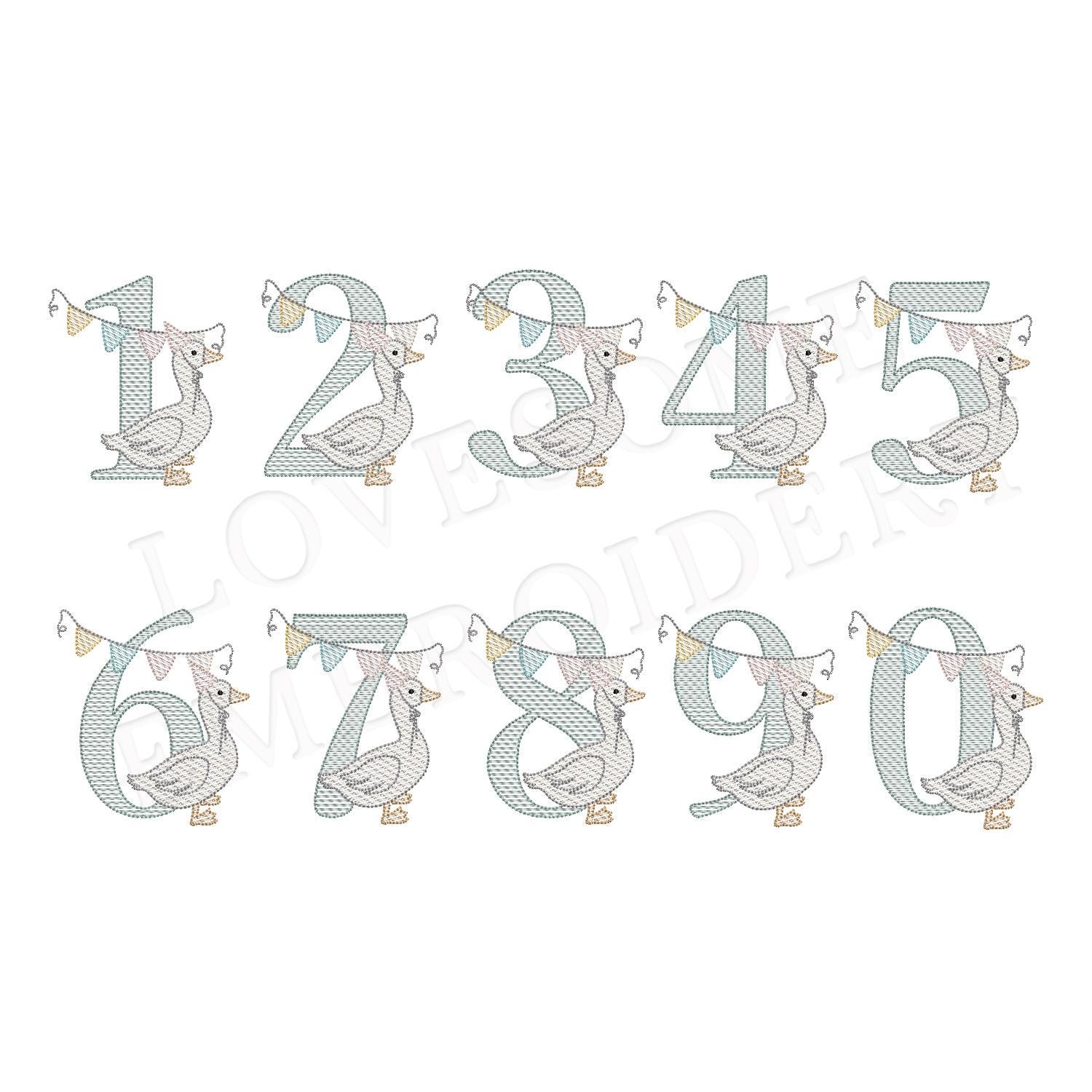 This listing features a machine embroidery numbers set which includes embroidery files of ten quick stitch numbers (0-9) with cute silly goose with a party hat and bunting design in one size for 4x4 hoops for machine embroidery. (For the whole set, pls see the listing images.)
