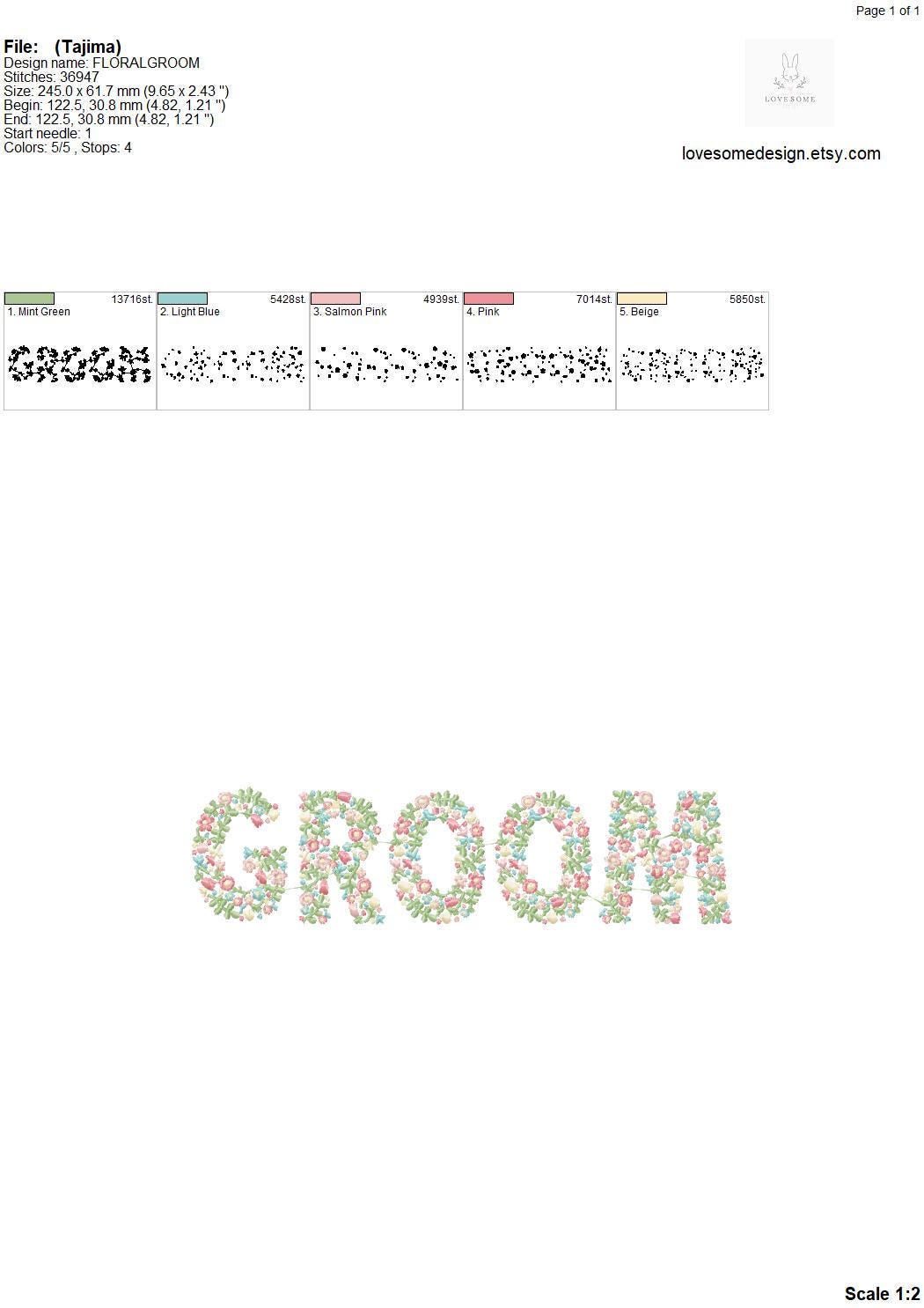 This listing features a machine embroidery file of word "GROOM" which has a beautiful dainty floral fill design with pastel spring colors in 10inch size.