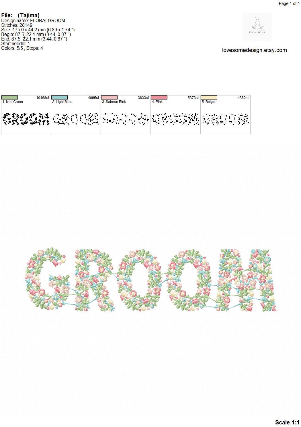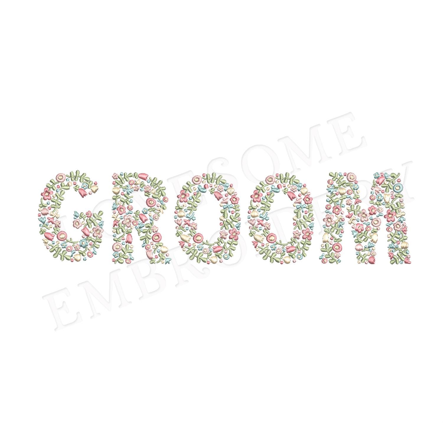 This listing features a machine embroidery file of word "GROOM" which has a beautiful dainty floral fill design with pastel spring colors in 7inch size.