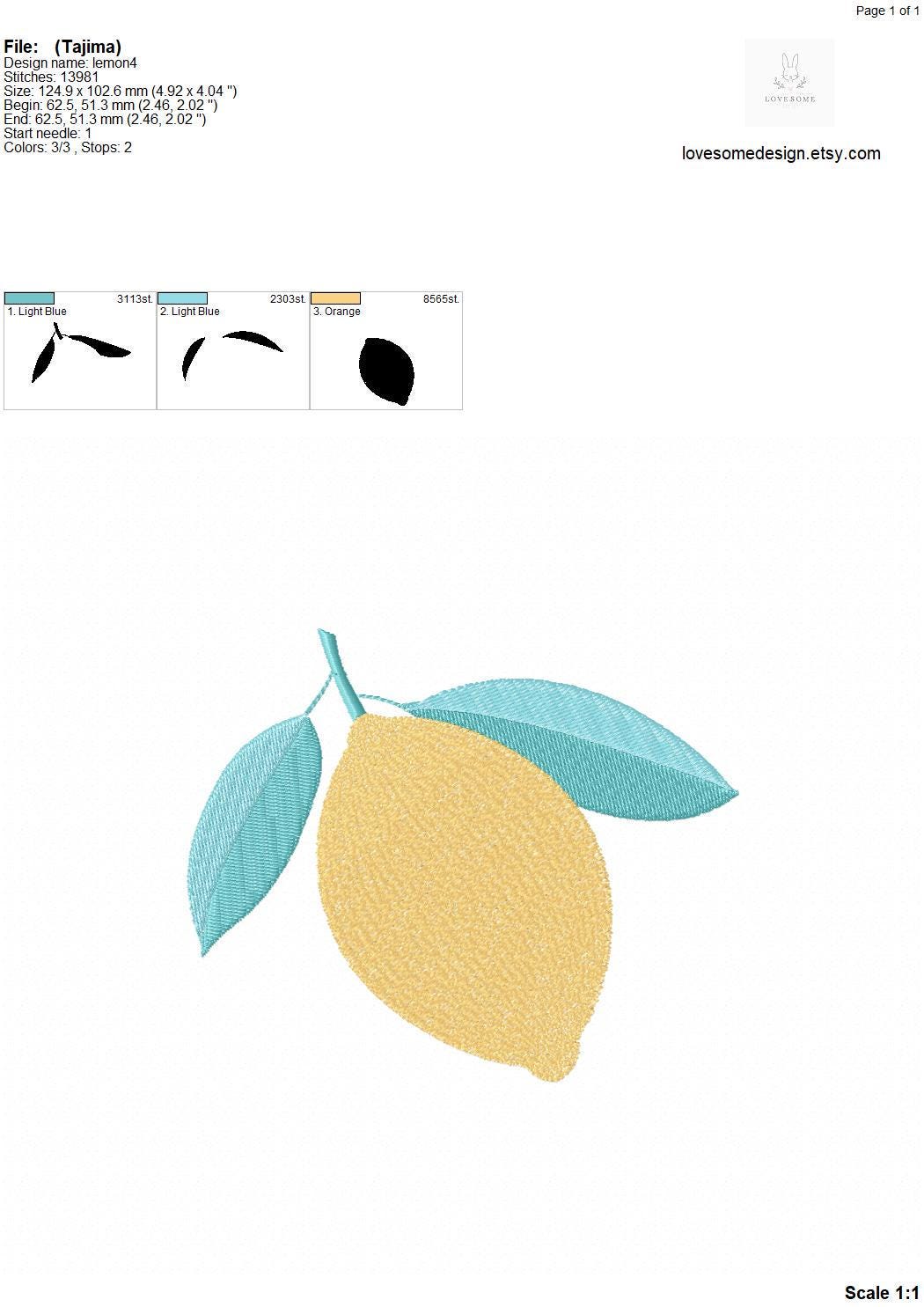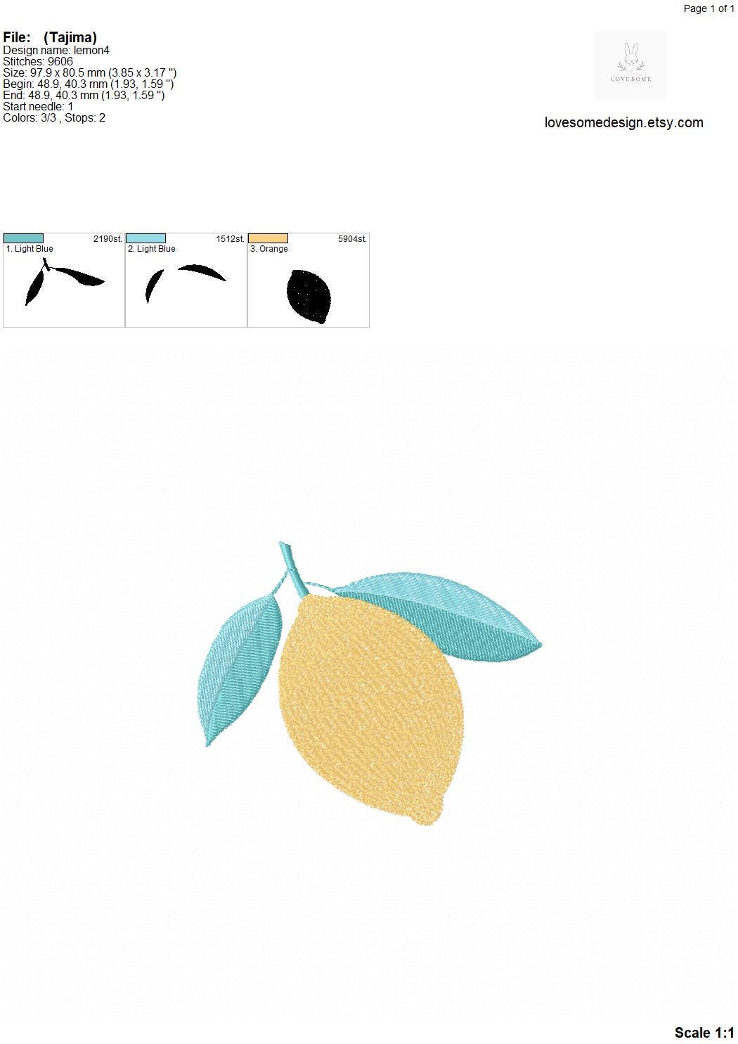 This listing includes one cute lemon design for machine embroidery in two sizes, appr. 4inch and 5inch size for embroidery hoops in different sizes.