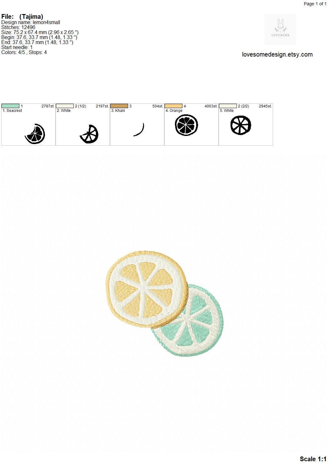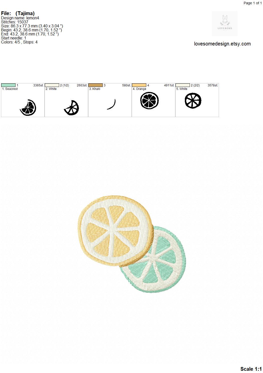 This listing includes one cute lemon slices design for machine embroidery in two sizes, appr. 3inch and 3.5inch size for embroidery hoops in different sizes.