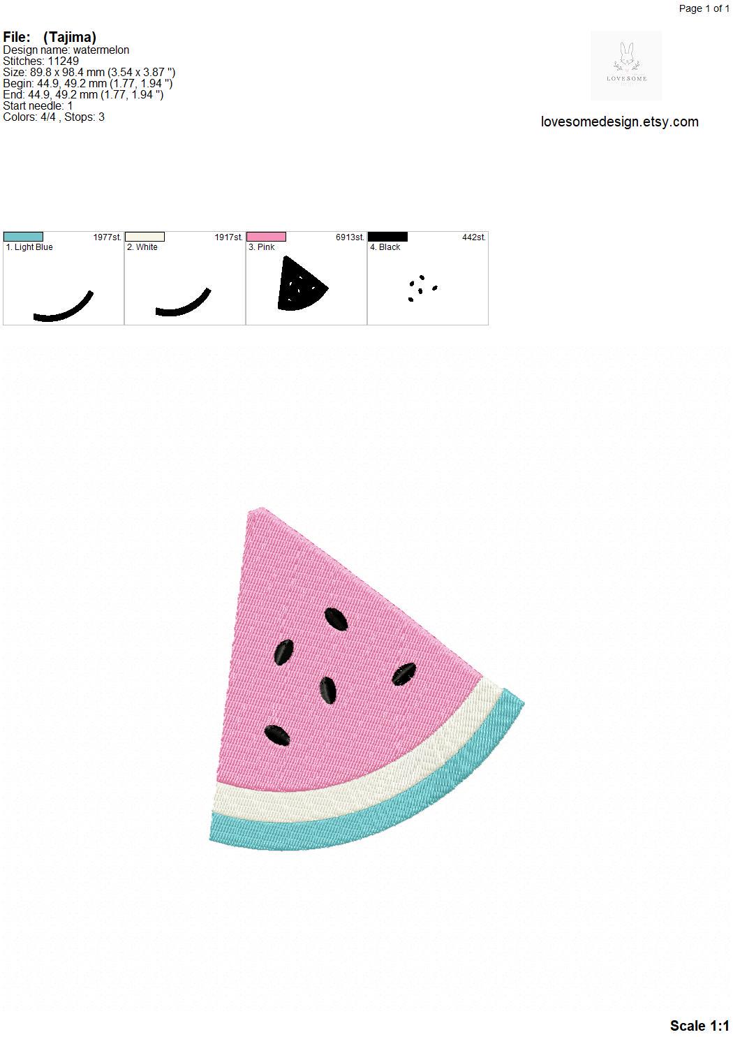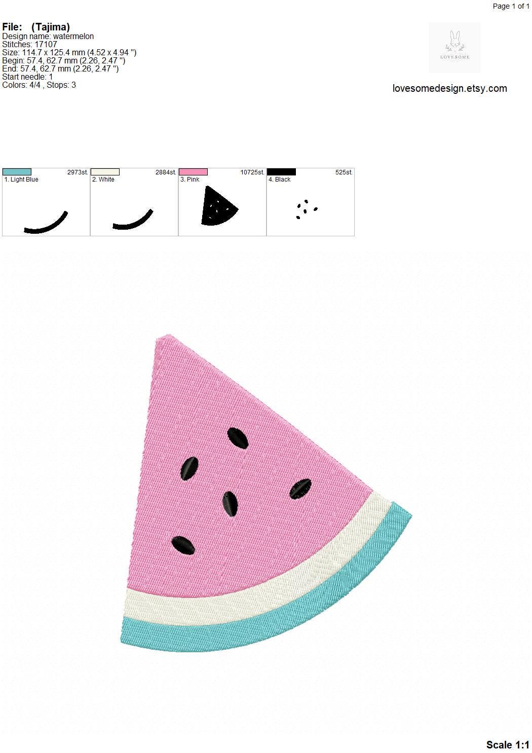 This listing includes one cute watermelon slice design for machine embroidery in two sizes, appr. 4inch and 5inch size for embroidery hoops in different sizes.