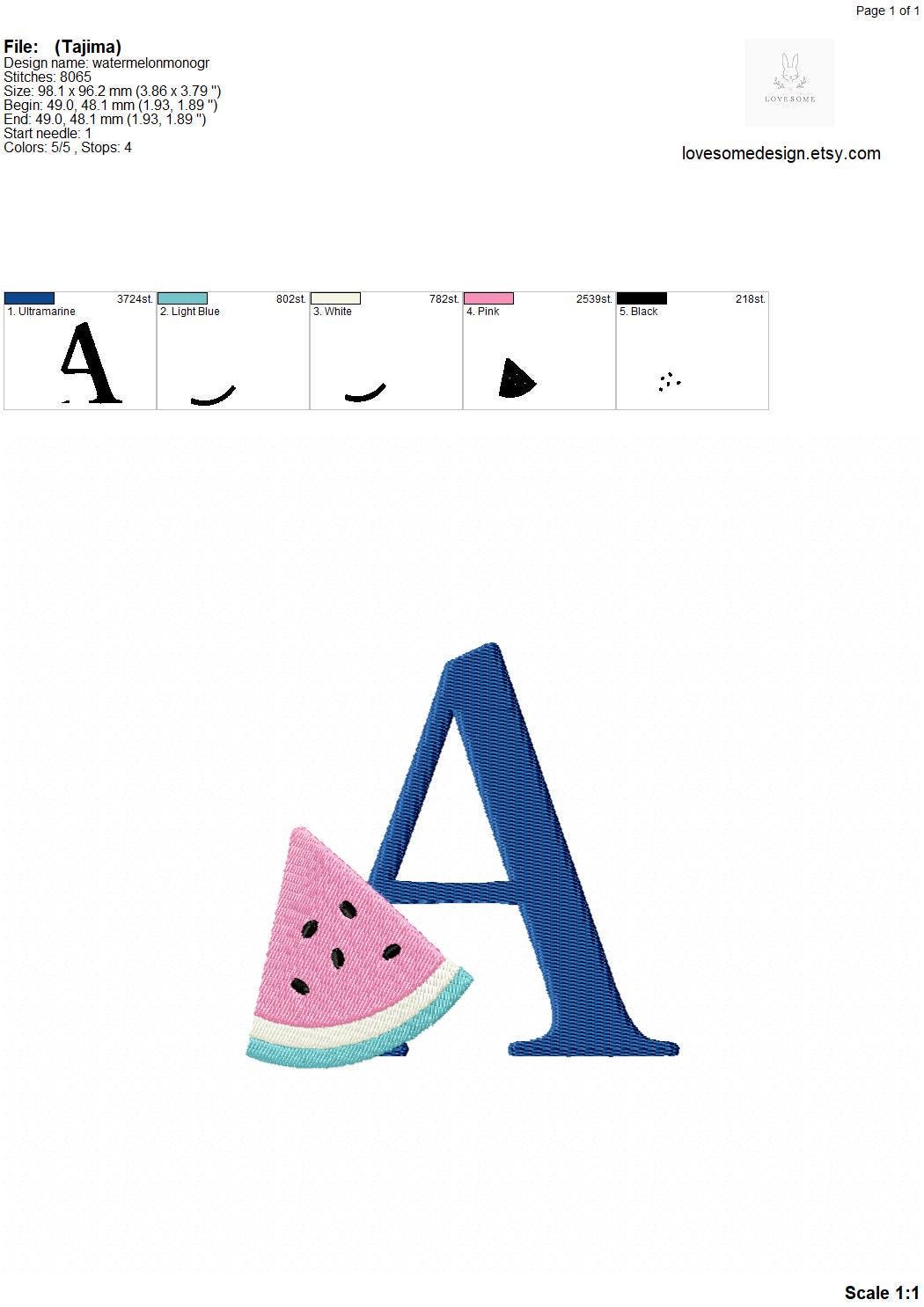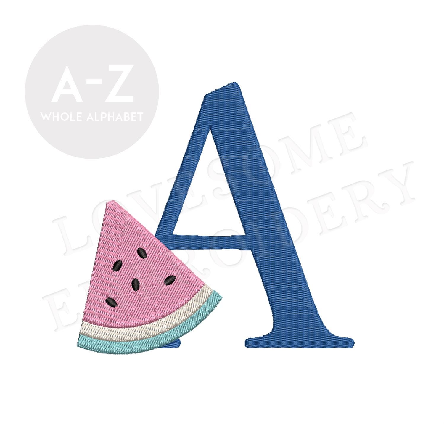 This listing features a machine embroidery font set which includes embroidery files of 26 uppercase embroidery letters with cute watermelon slice design in 4inch size. (For the whole set, pls see the listing images.)