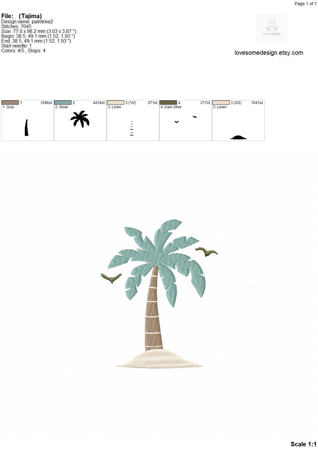 This listing includes one palm tree design for machine embroidery in three sizes, each appr. in 3inch, 3.5inch and 4inch for embroidery hoops 4x4 and bigger.