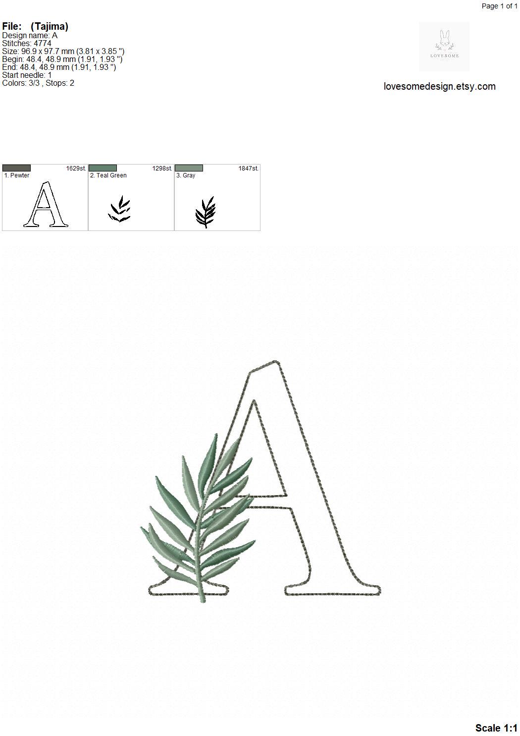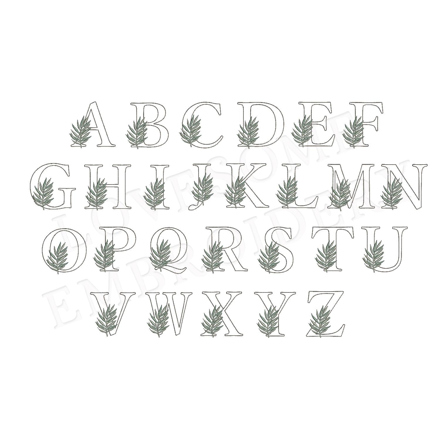 This listing features a machine embroidery font set which includes embroidery files of 26 uppercase outline embroidery letters with stylish palm leaf design in 4inch size. (For the whole set, pls see the listing images.)