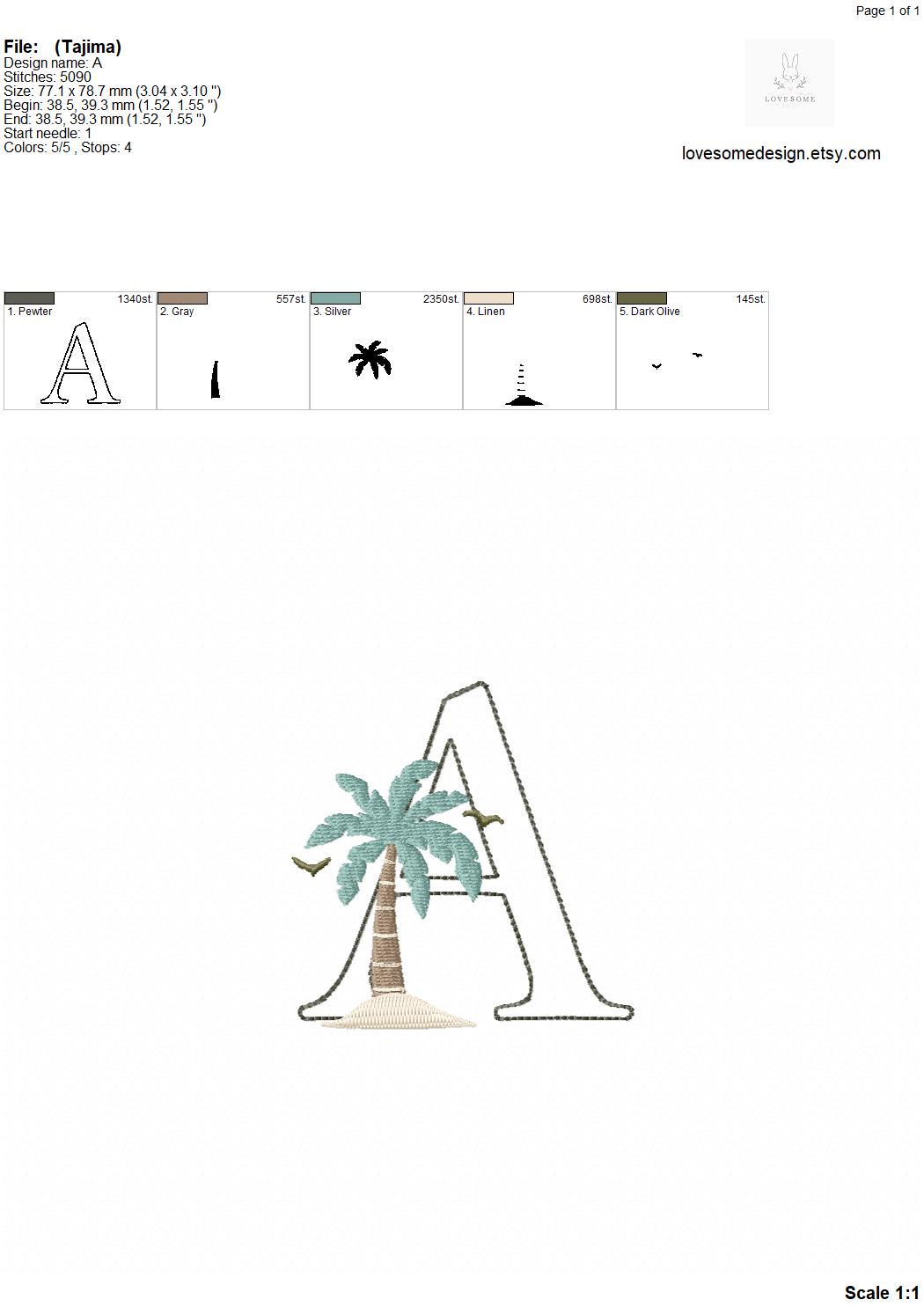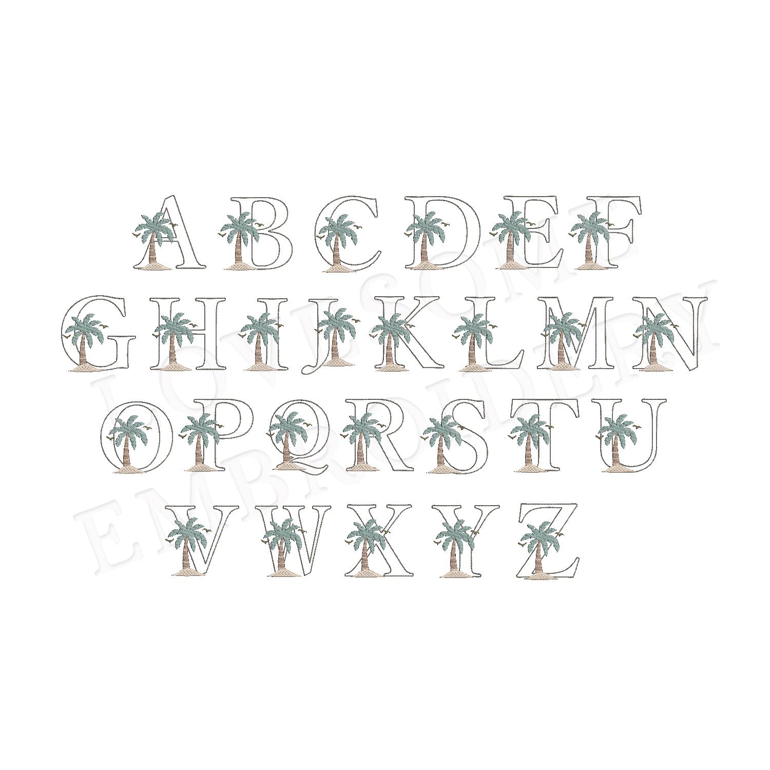 This listing features a machine embroidery font set which includes embroidery files of 26 uppercase outline embroidery letters with stylish palm tree design in 3inch size. (For the whole set, pls see the listing images.)