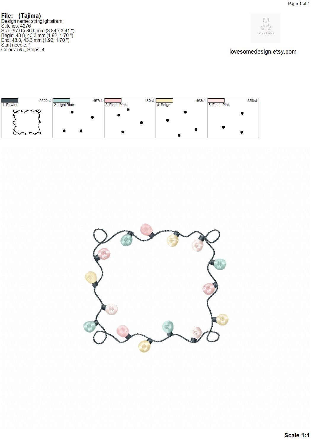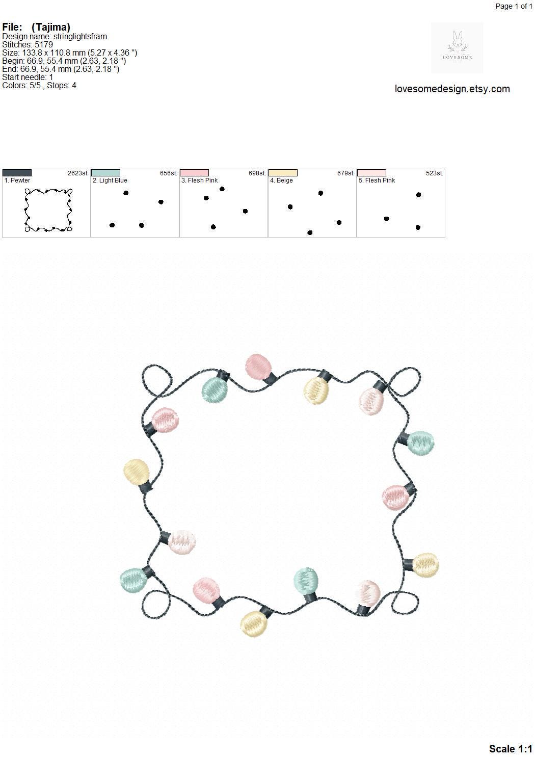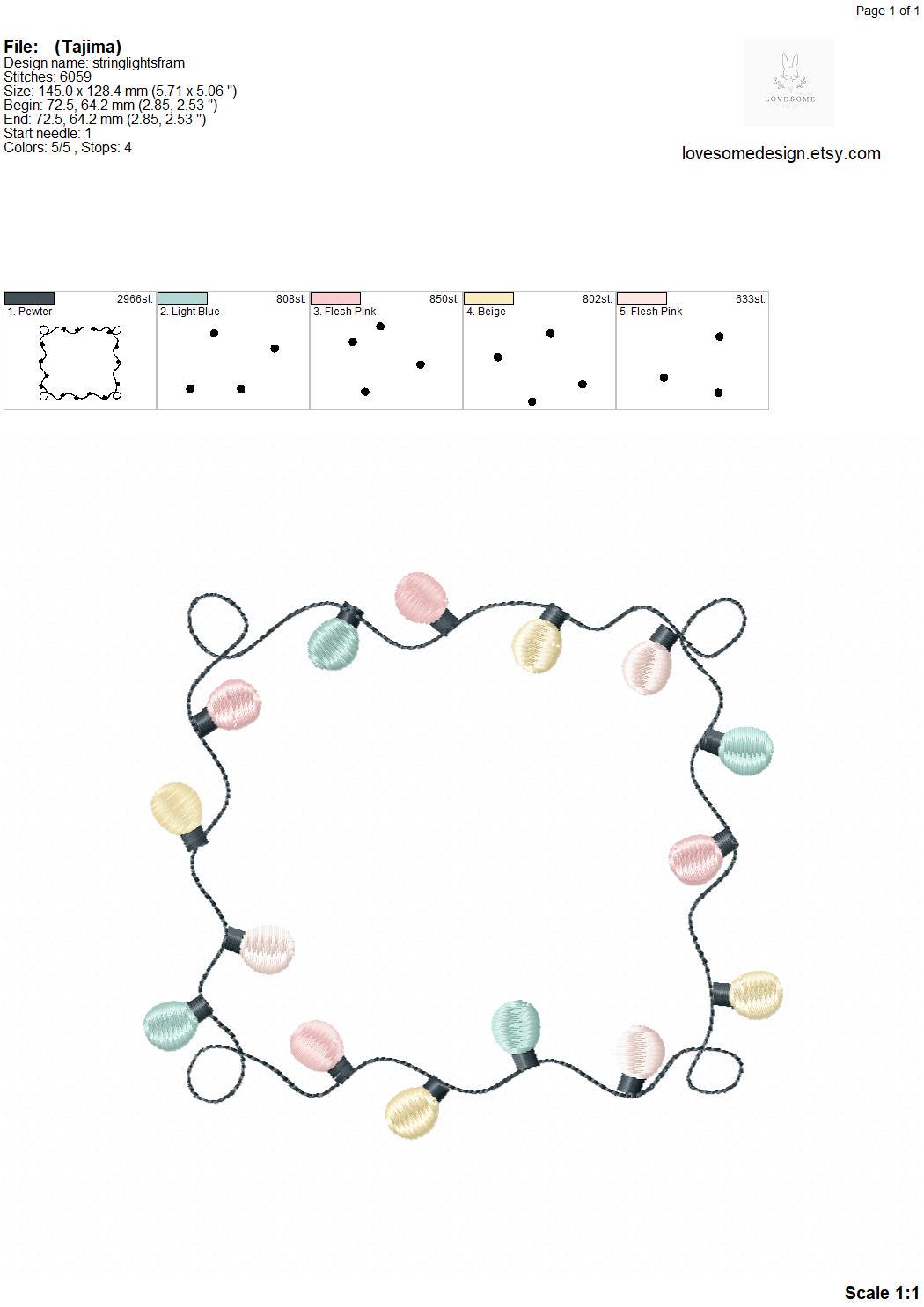 This listing features a machine embroidery file of string lights frame design in three big sizes, including 4inch, 5inch and 6inch.
