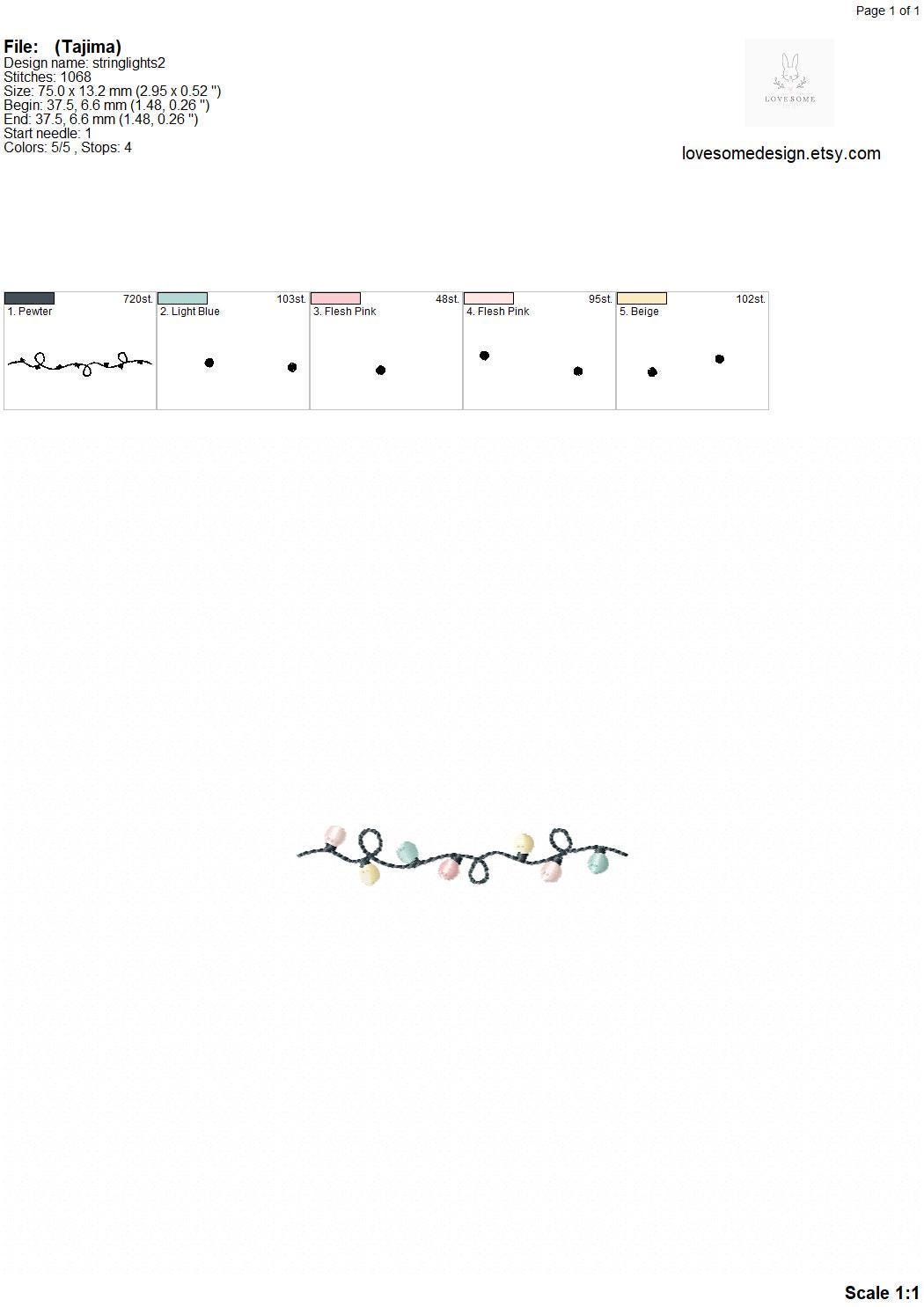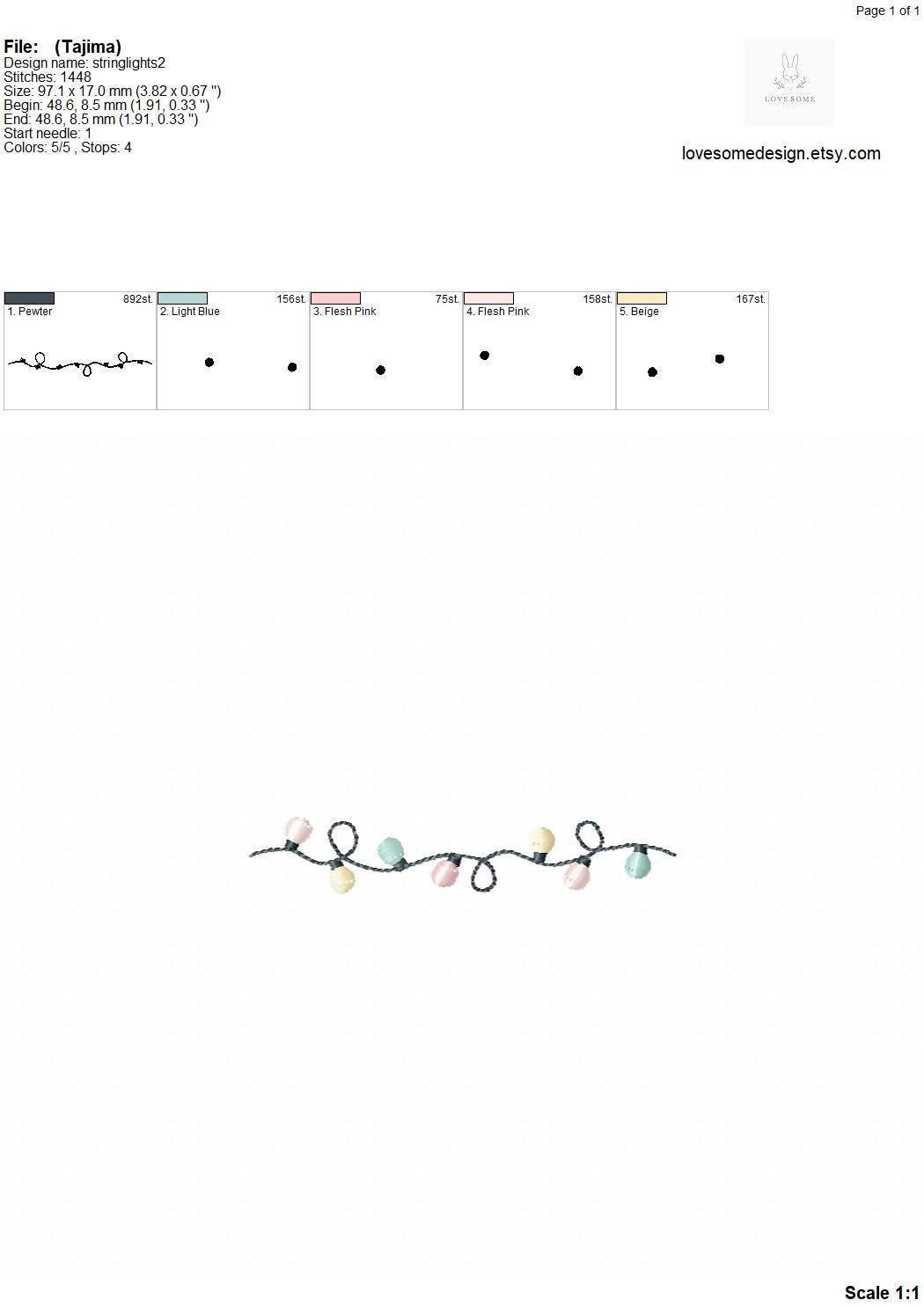 This listing features a machine embroidery file of string lights design in three small sizes, including 3inch, 3.5inch and 4inch.
