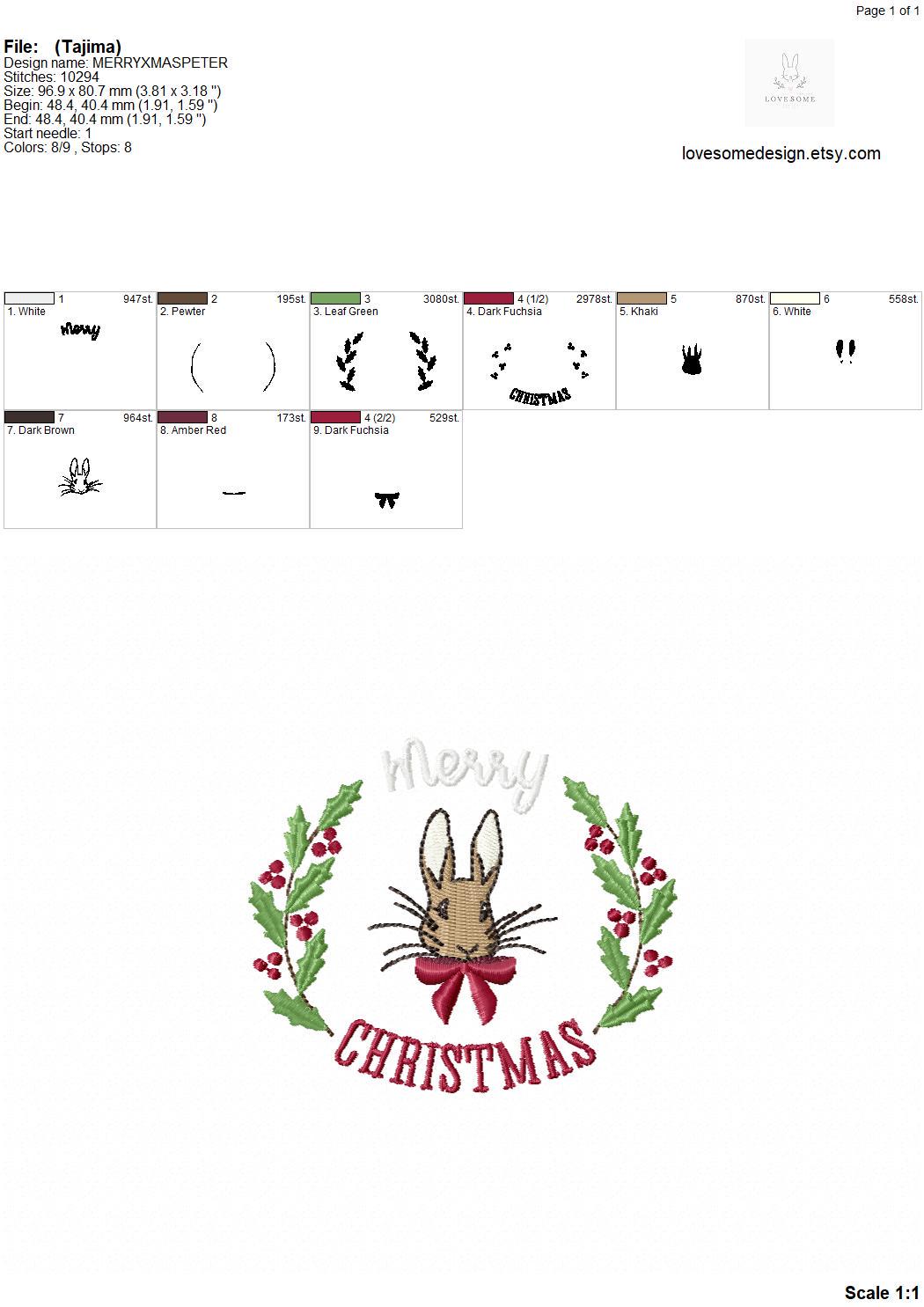 This listing features one machine embroidery files of Peter Rabbit "Merry Christmas" wreath design in 4inch size.