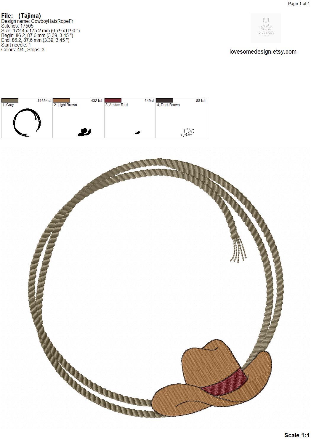 This listing includes one cowboy rope frame with a cowboy hat design for machine embroidery in 7inch size.