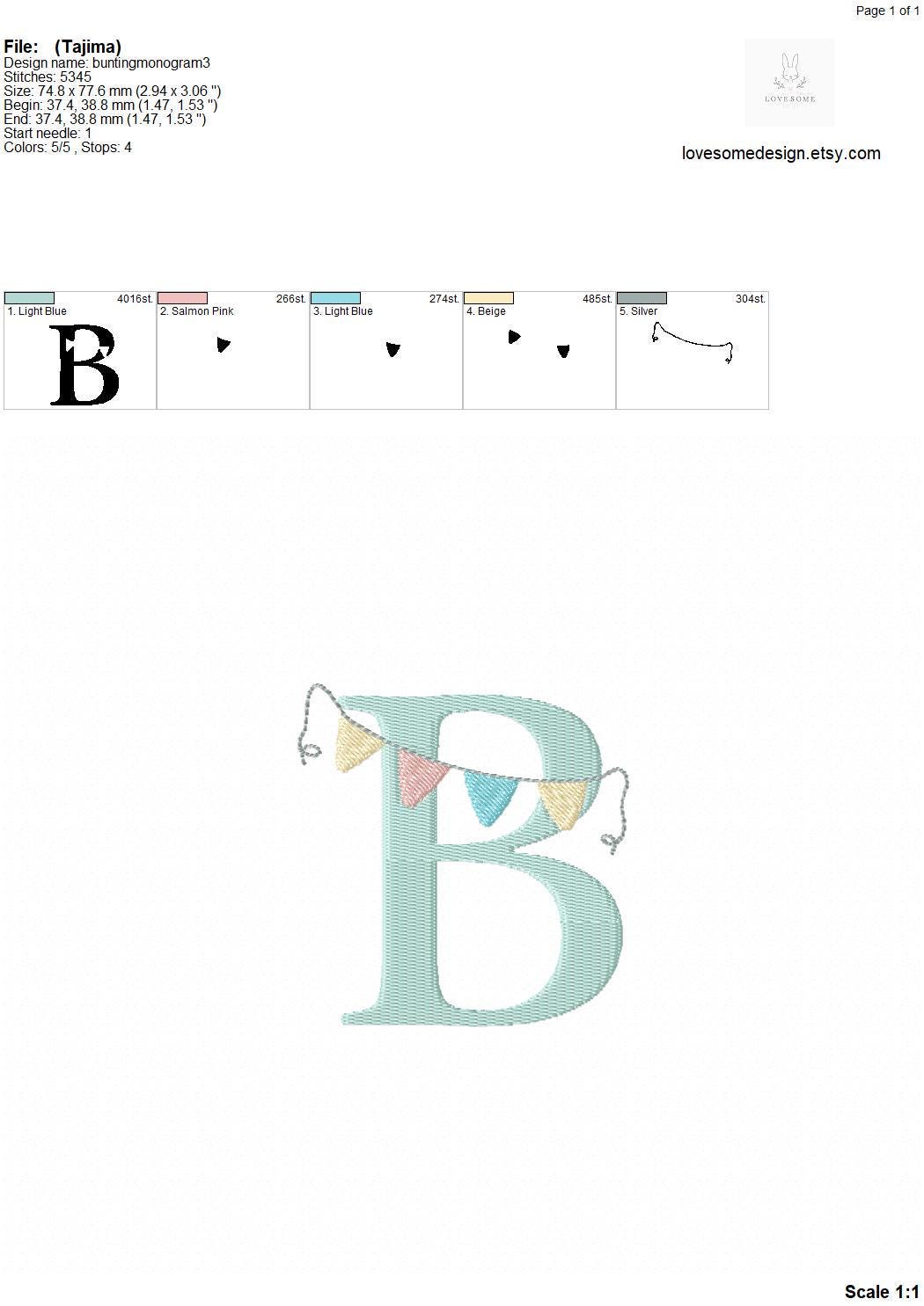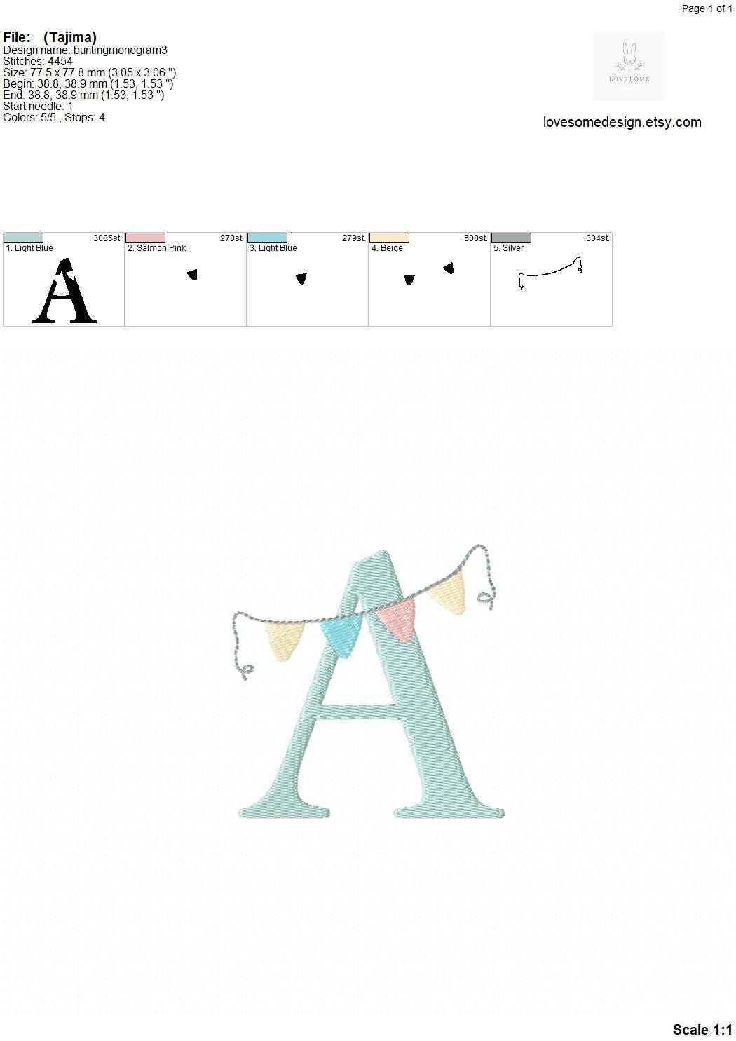 This listing features a machine embroidery font set which includes embroidery files of 26 uppercase monogram letters with bunting design in 3inch size. (For the whole set, pls see the listing images.)