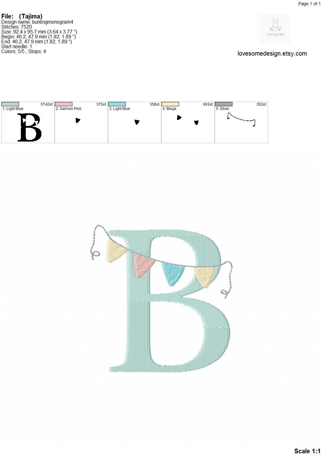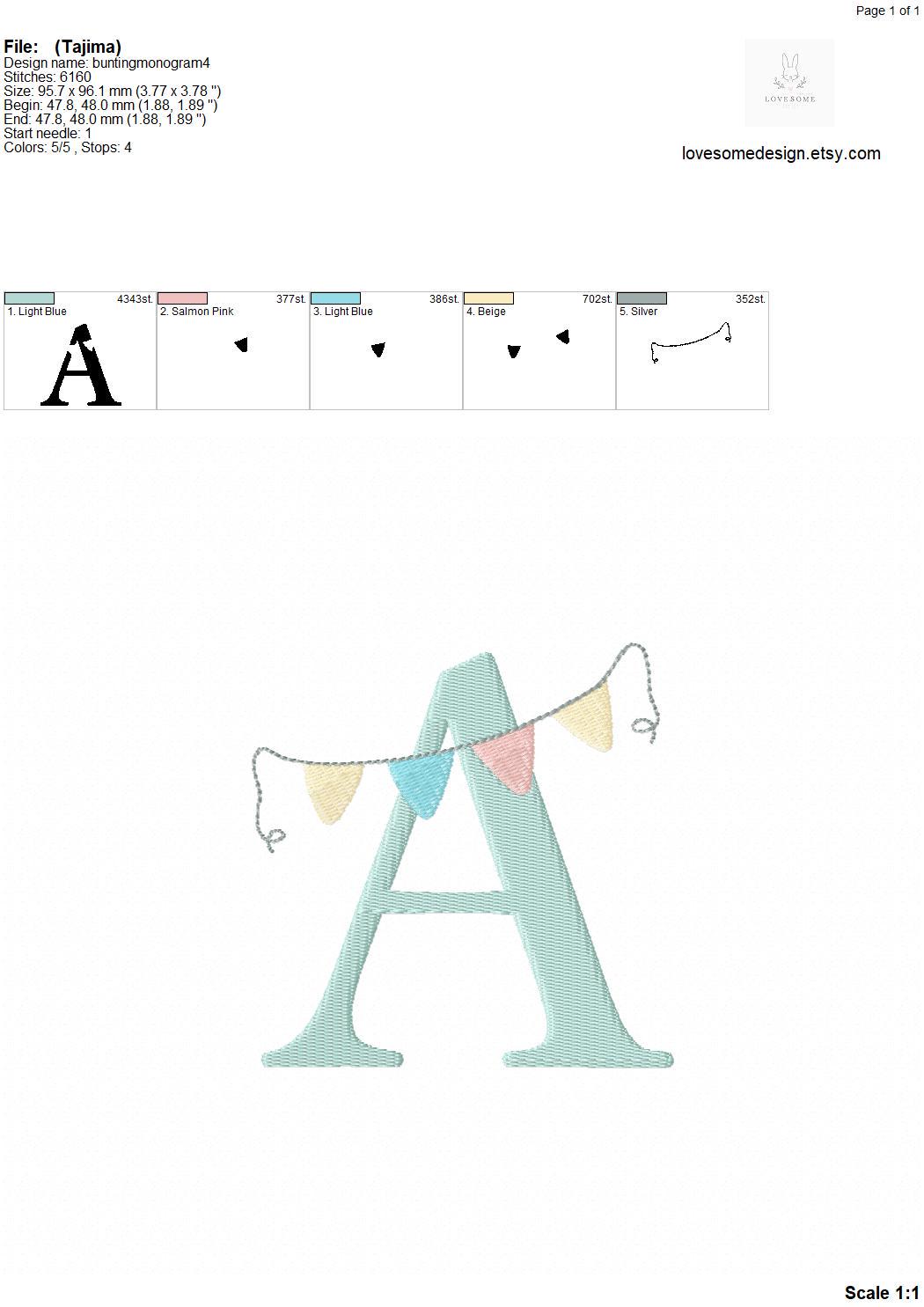 This listing features a machine embroidery font set which includes embroidery files of 26 uppercase monogram letters with bunting design in 4inch size. (For the whole set, pls see the listing images.)