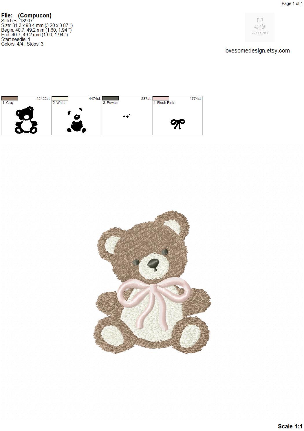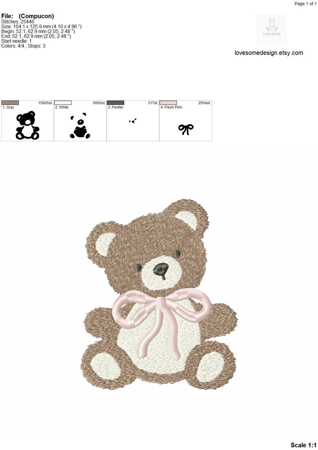 This listing includes one cute plush teddy design with a lovely bow for machine embroidery in two big sizes, each appr. in 4inch and 5inch size for embroidery hoops in different sizes.