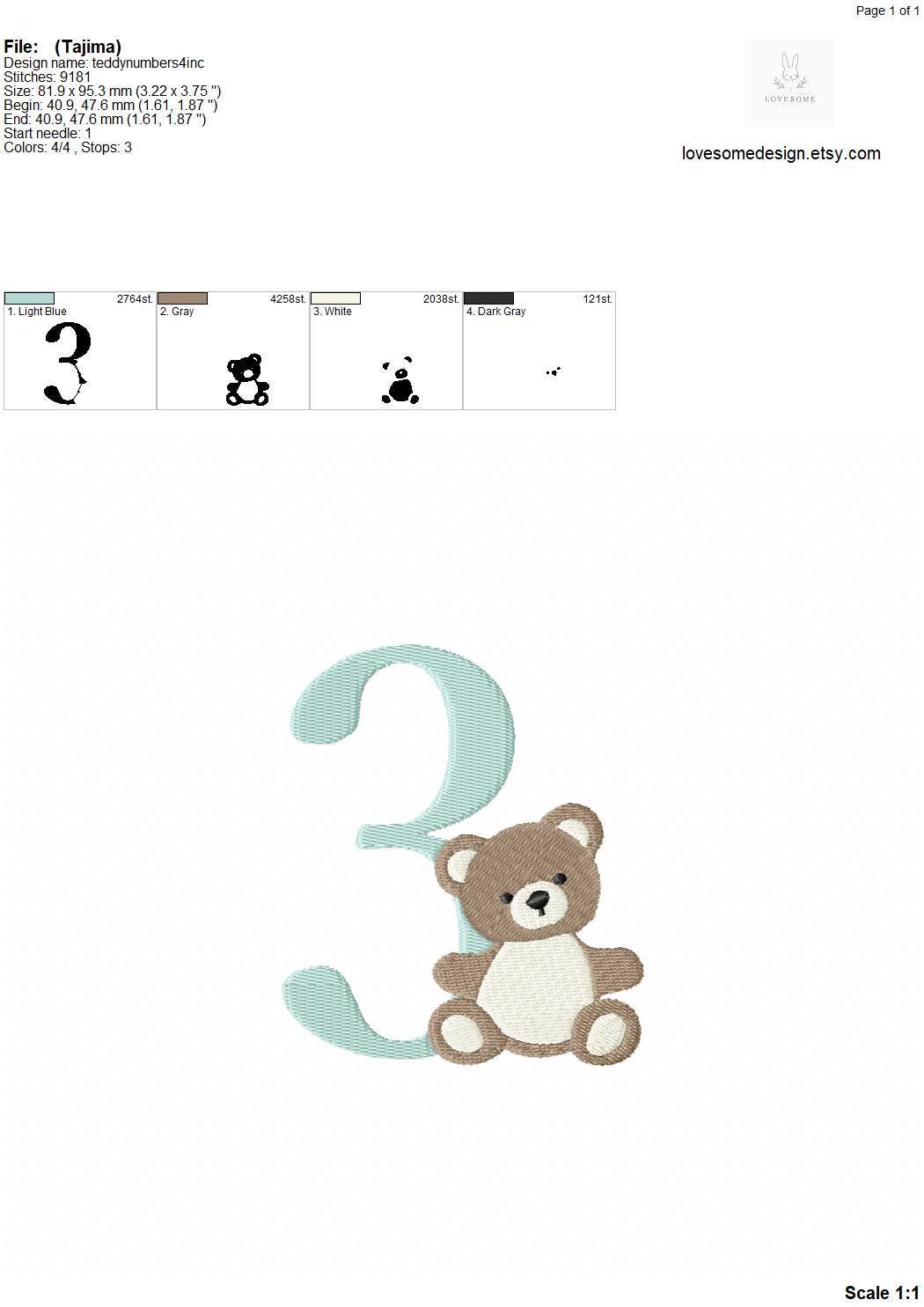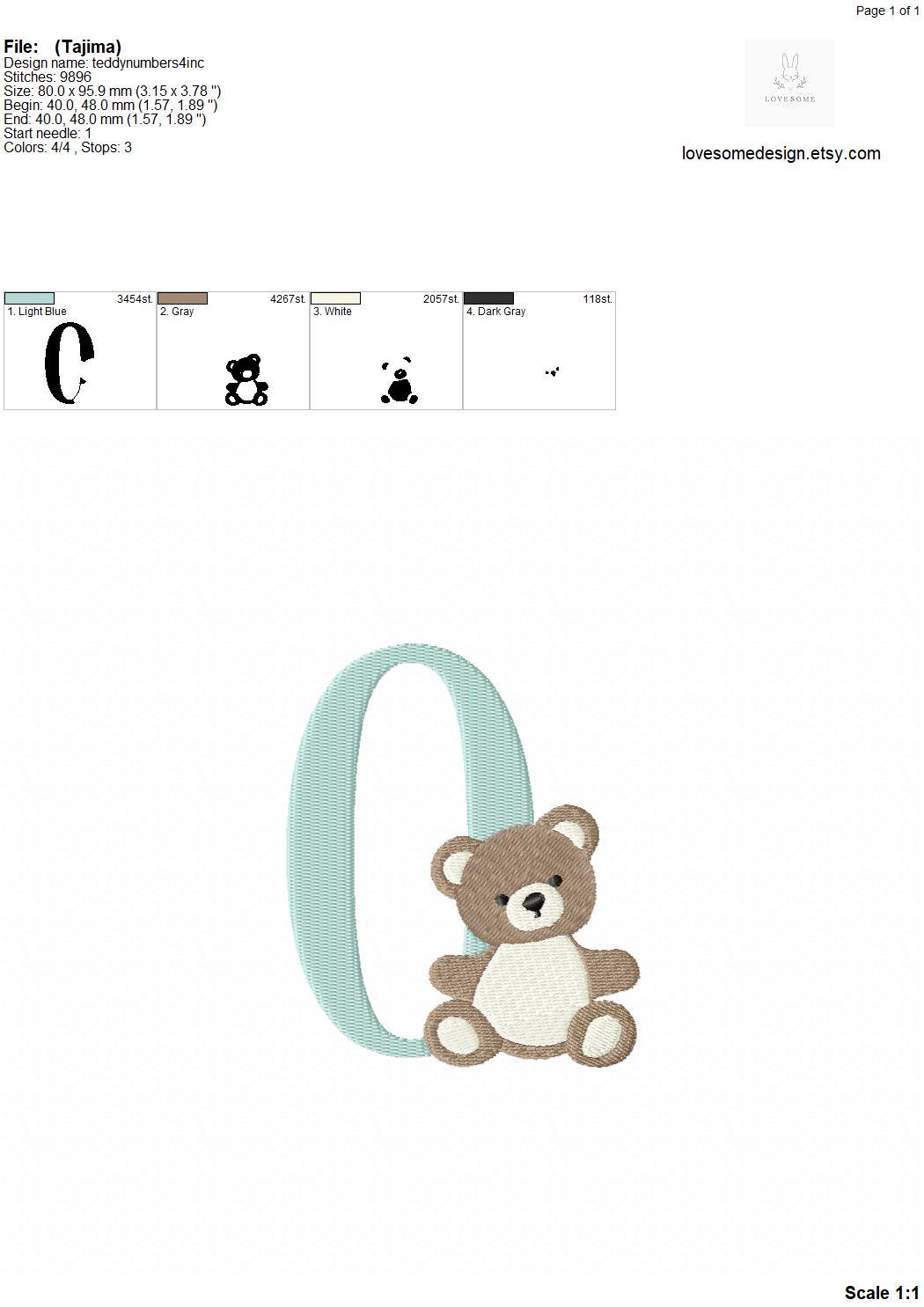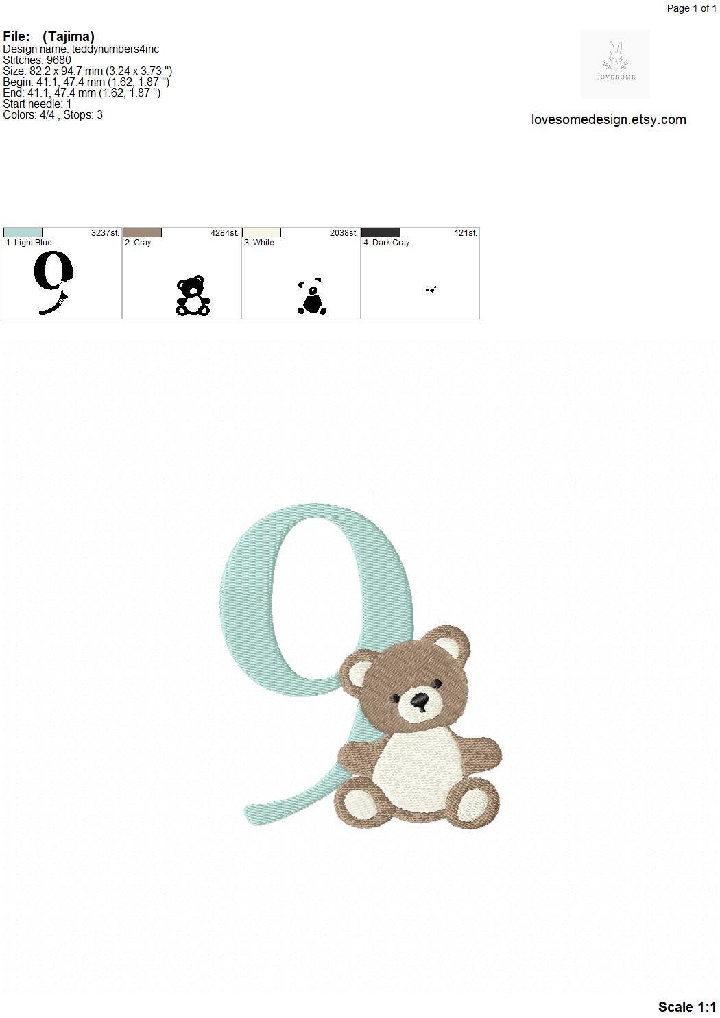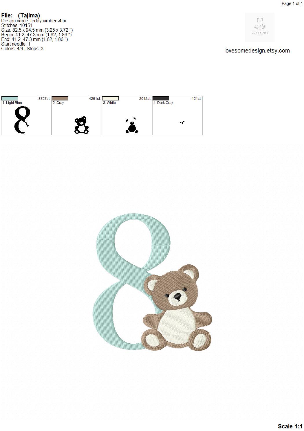 This listing features a machine embroidery numbers set which includes embroidery files of ten numbers (0-9) with cute teddy design in one size for 4x4 hoops for machine embroidery. (For the whole set, pls see the listing images.)