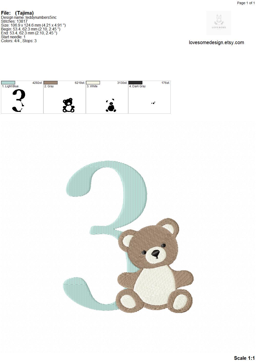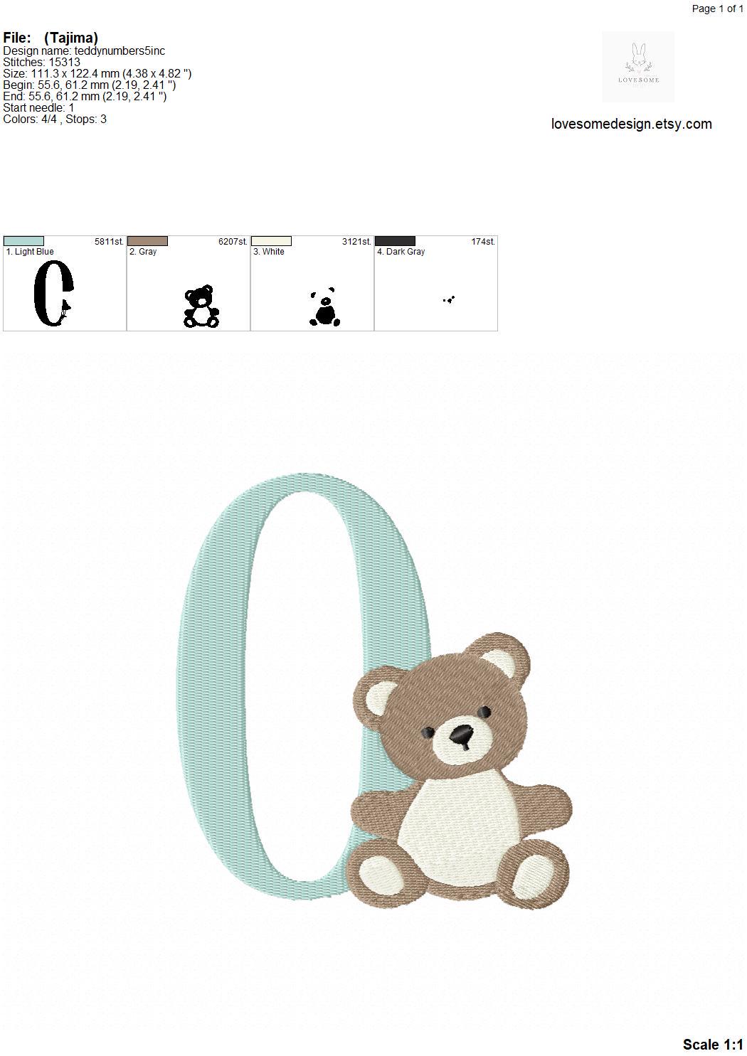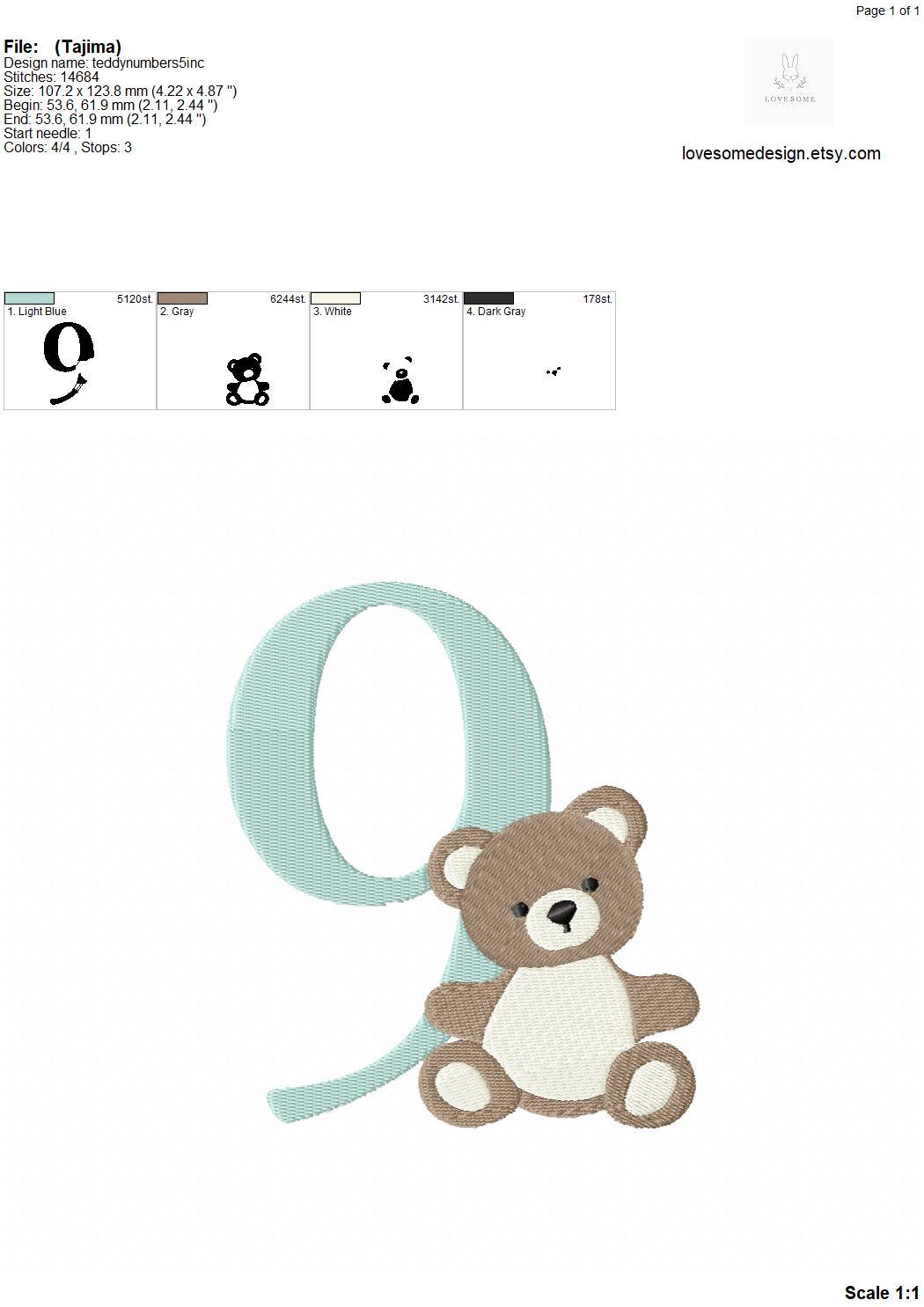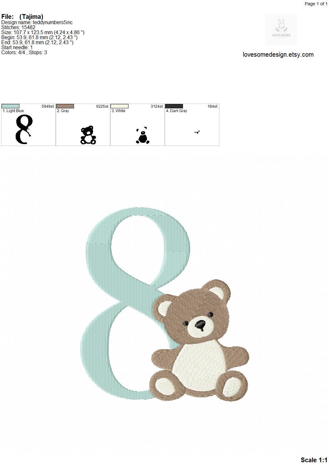 This listing features a machine embroidery numbers set which includes embroidery files of ten numbers (0-9) with cute teddy design in 5inch size for machine embroidery. (For the whole set, pls see the listing images.)