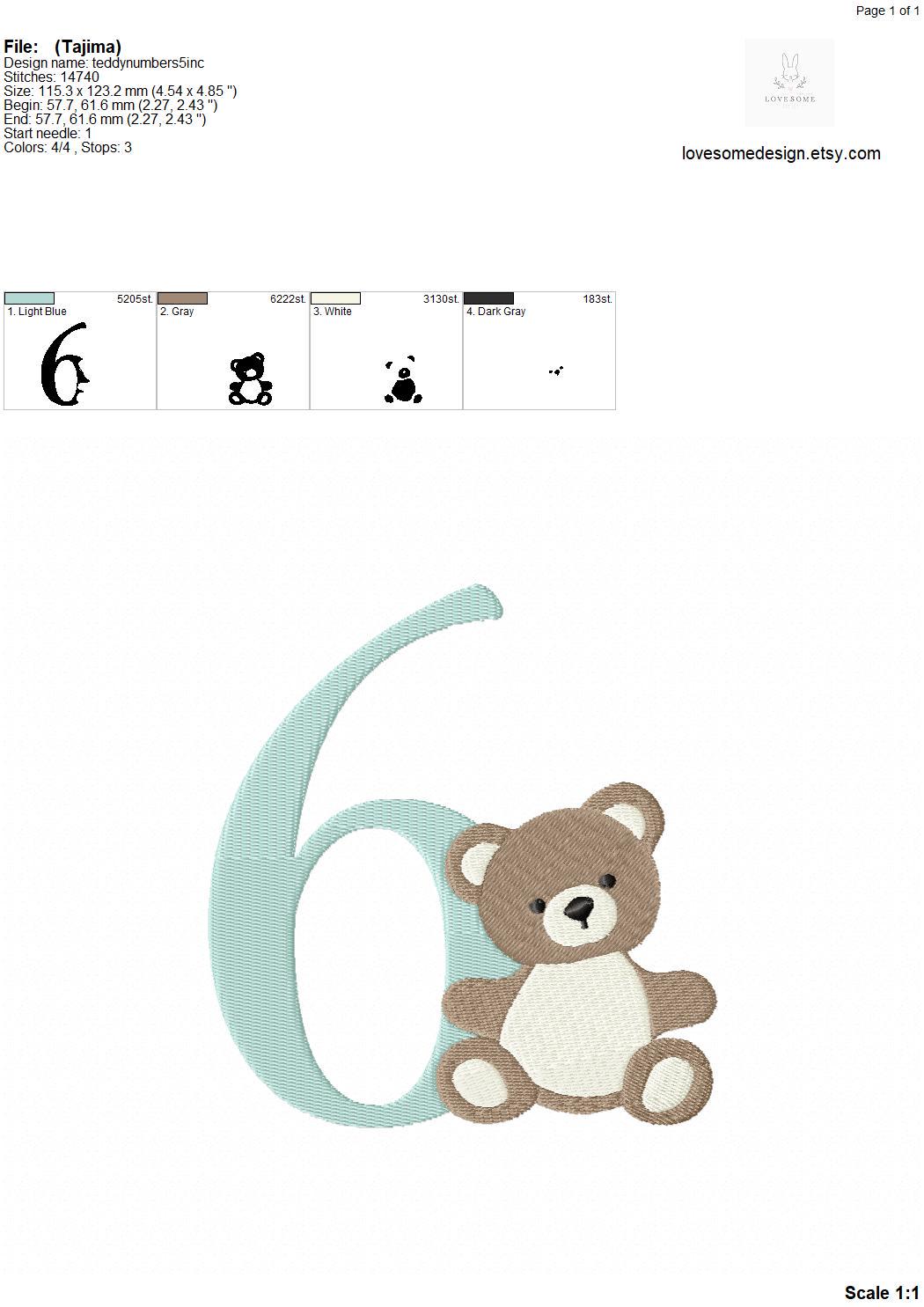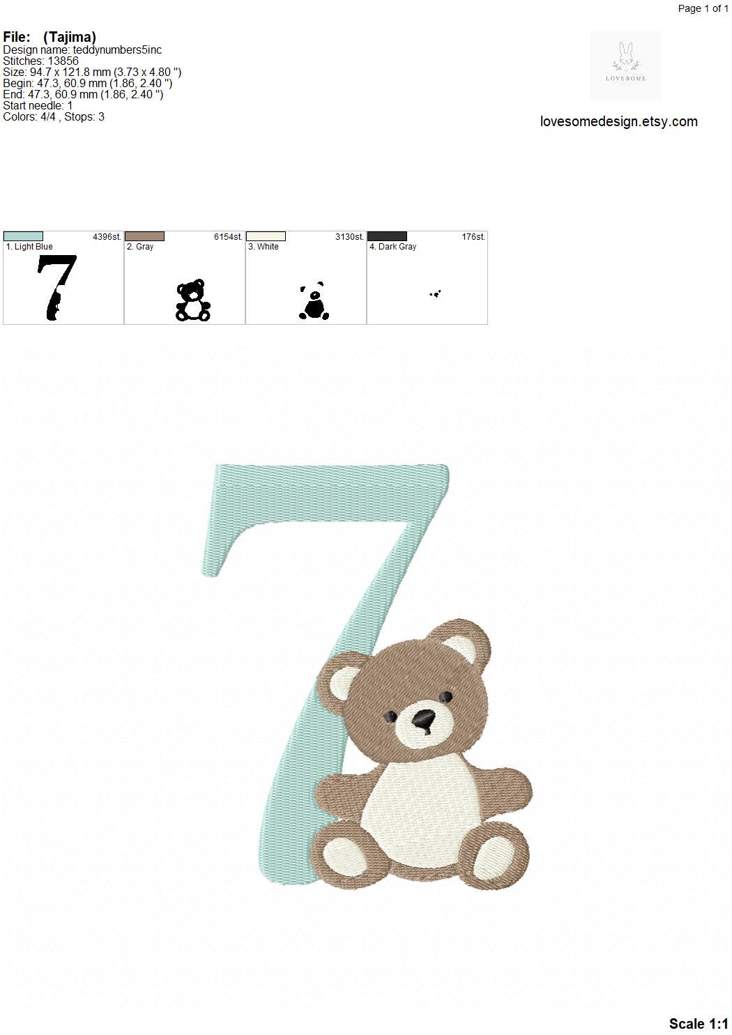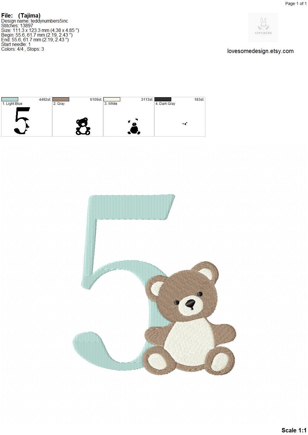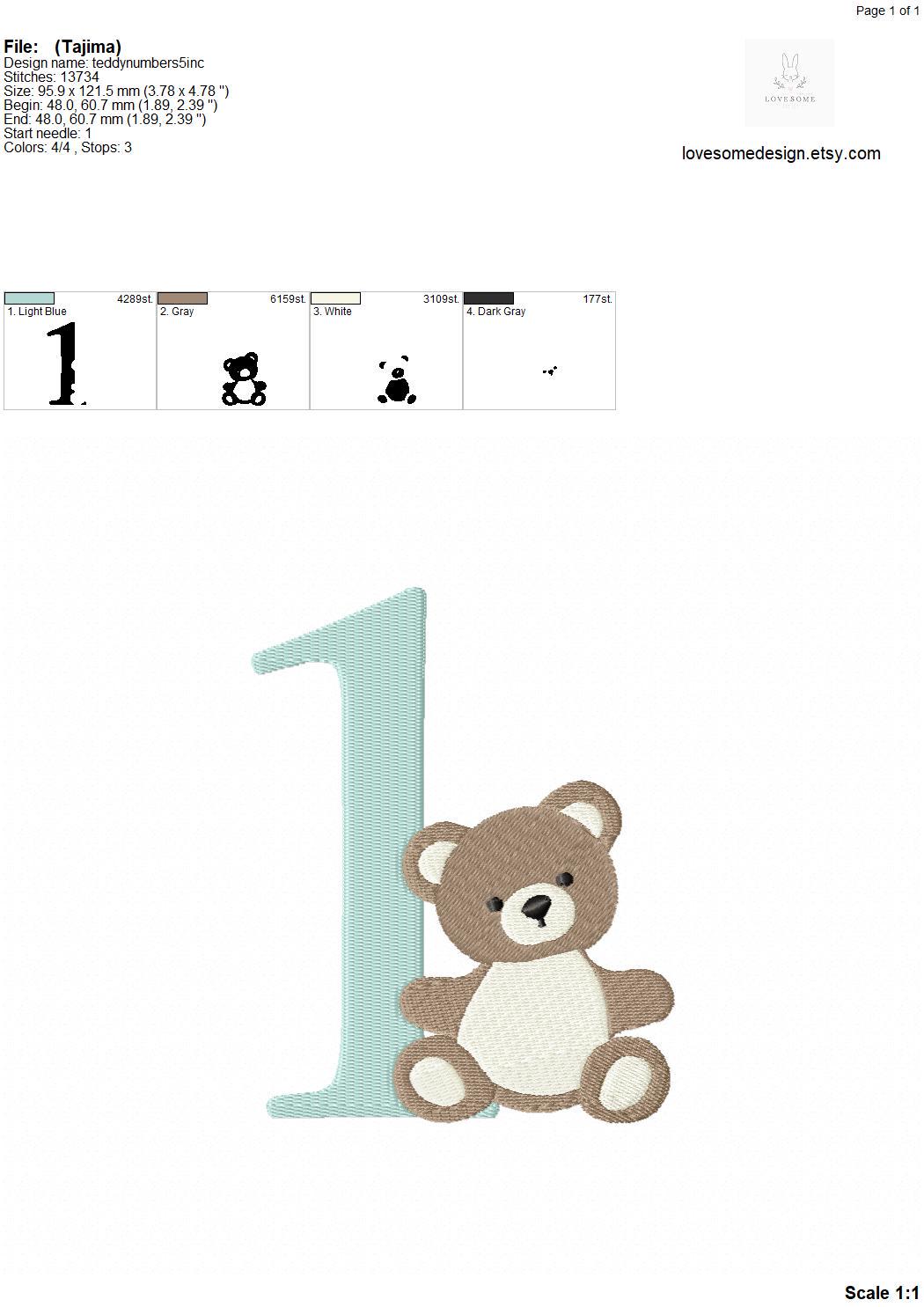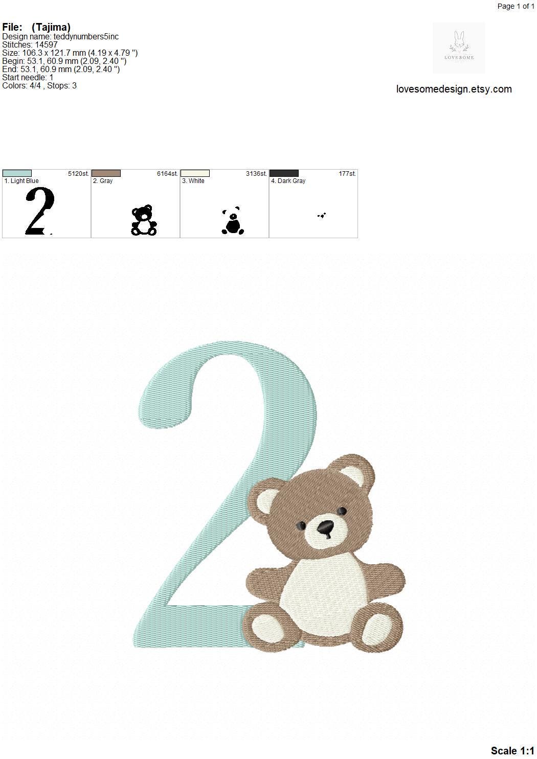 This listing features a machine embroidery numbers set which includes embroidery files of ten numbers (0-9) with cute teddy design in 5inch size for machine embroidery. (For the whole set, pls see the listing images.)