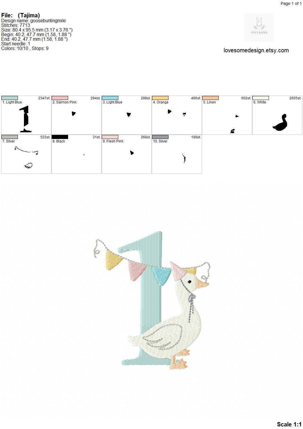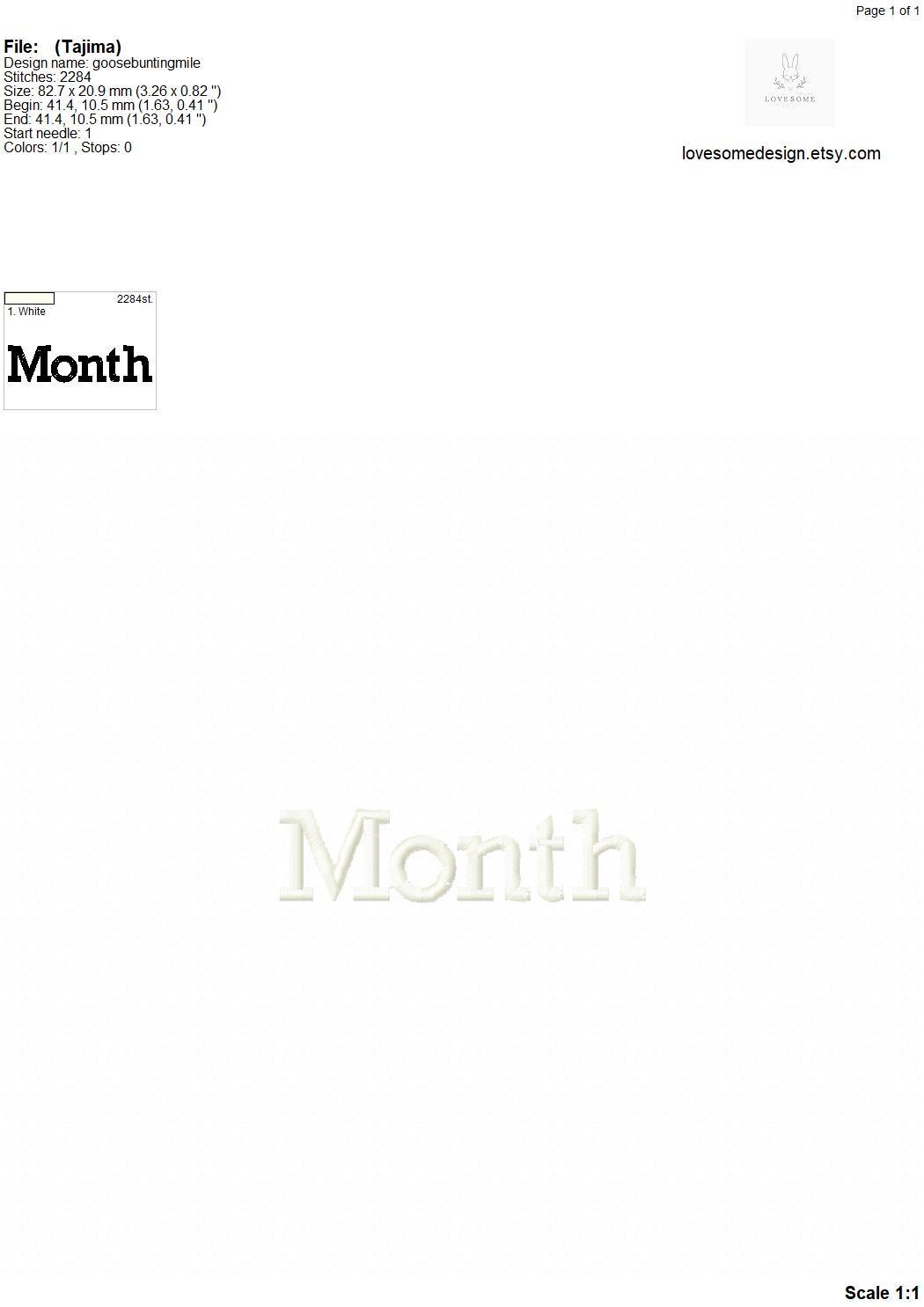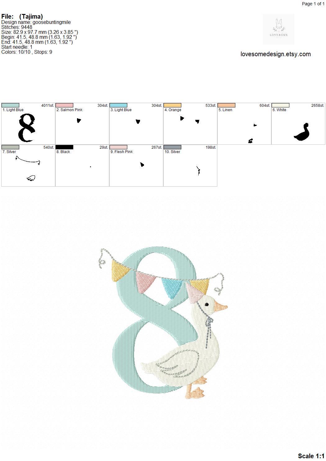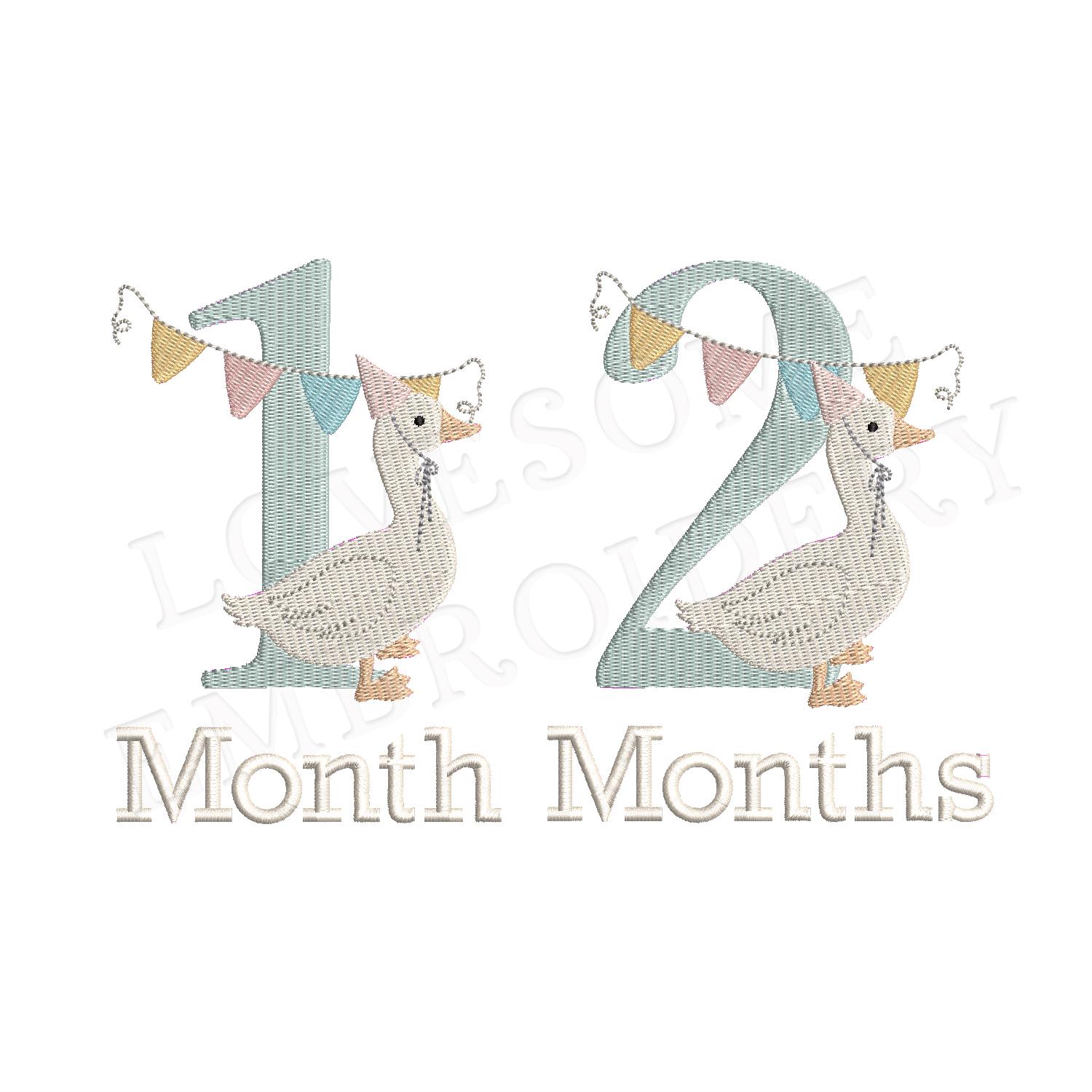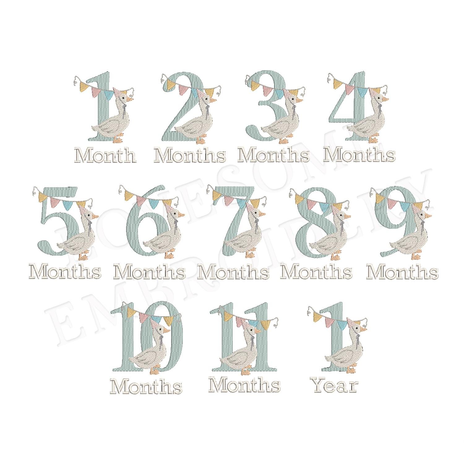 This listing includes number set ( 1 - 11 ) of cute silly gooose and three letterings "Month", "Months" and "Year" in 4 inch size, can be stitched with two hoopings on 4x4 embroidery hoops. (For the whole set, pls see the listing images.)