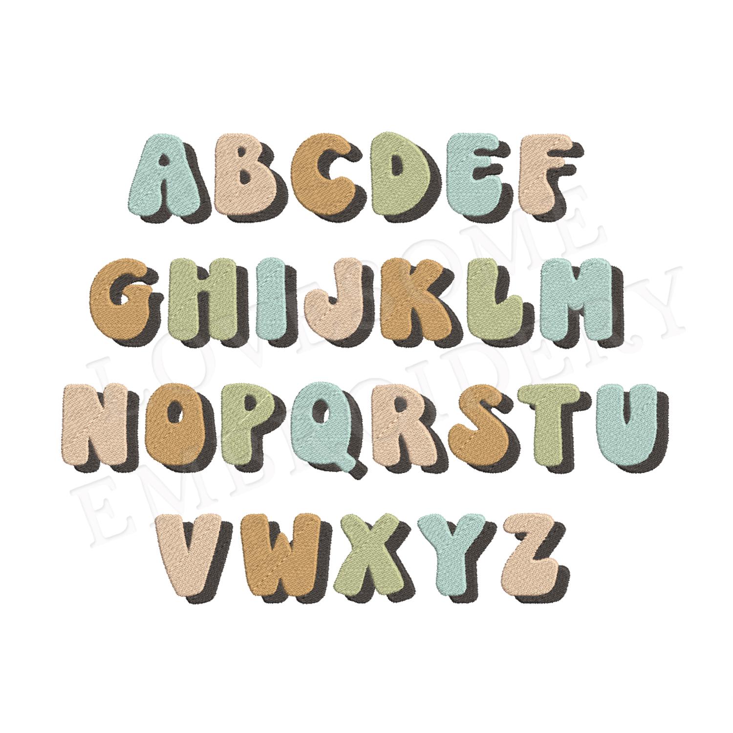 This listing features a machine embroidery groovy font set which includes embroidery files of 26 uppercase shadow letters in 2inch size. (For the whole set, pls see the listing images.)