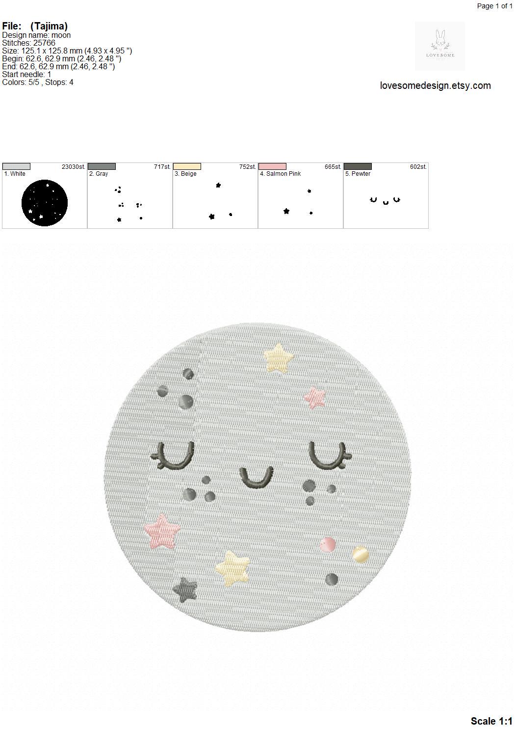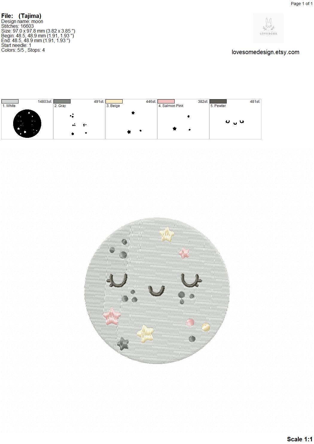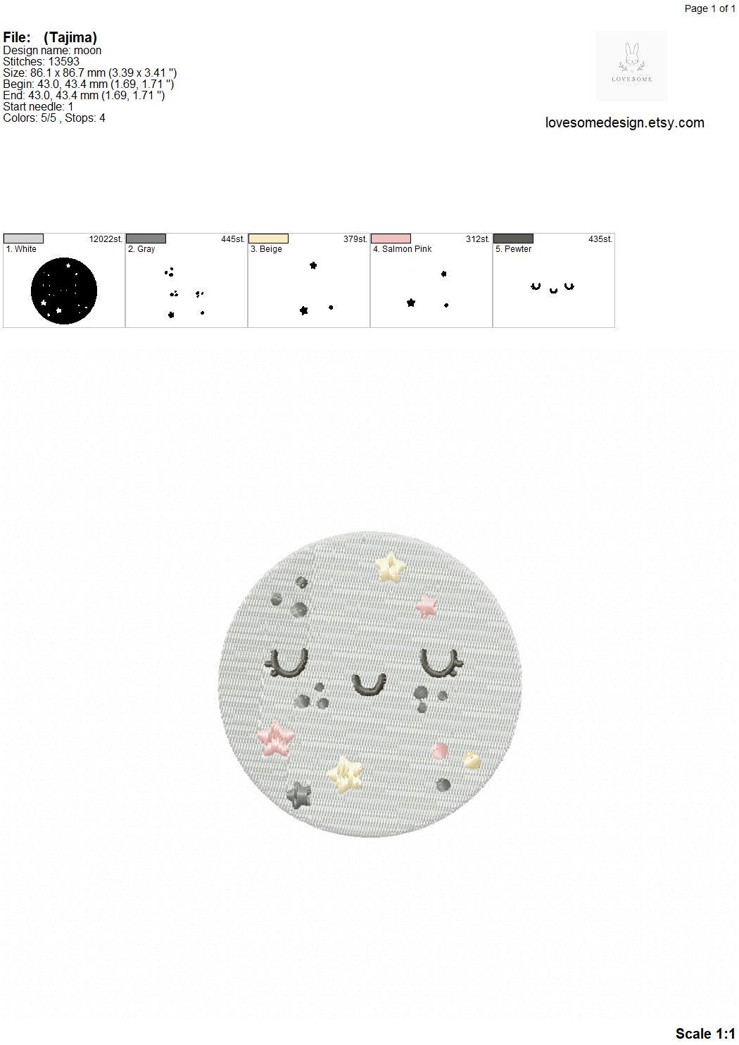 This listing includes one cute moon design for machine embroidery in three big sizes, each appr. in 3.5inch, 4inch and 5inch size for embroidery hoops in different sizes.