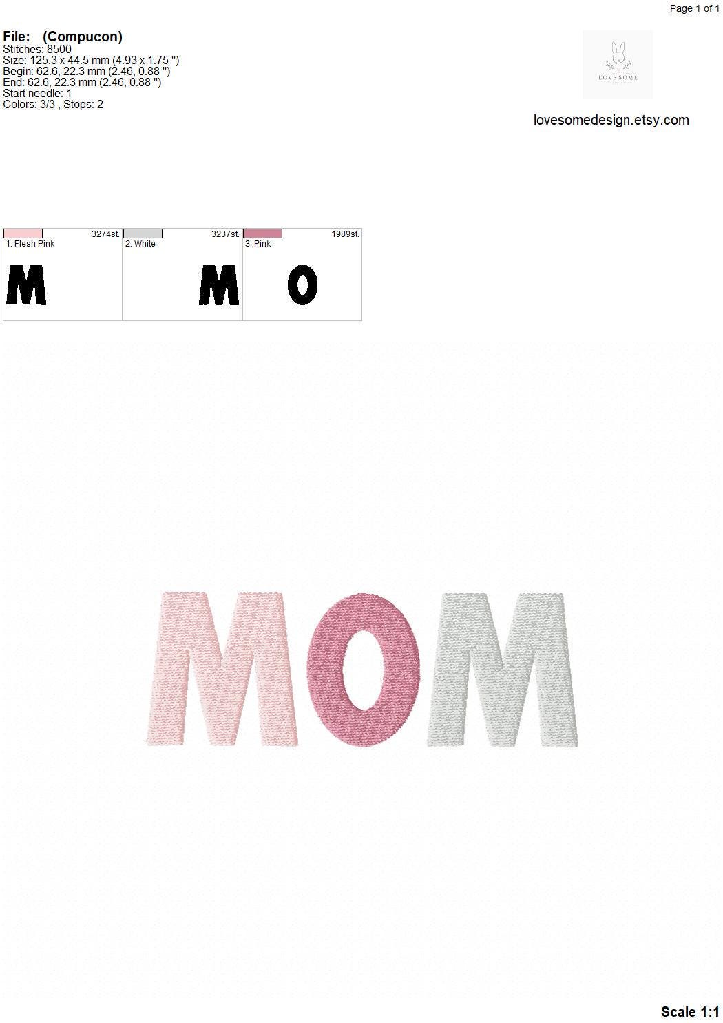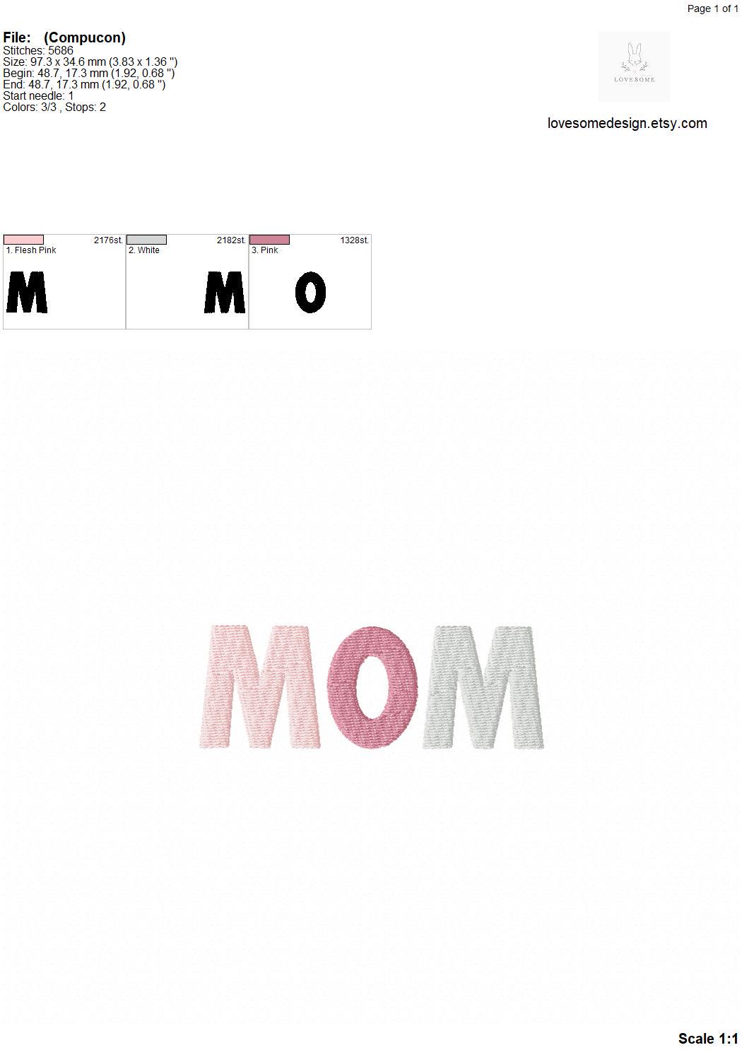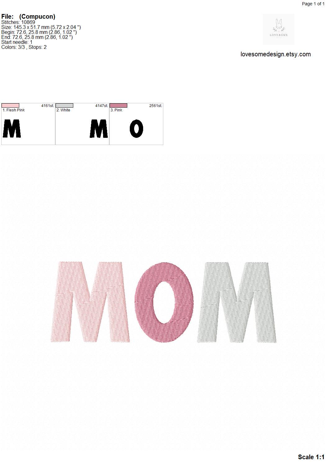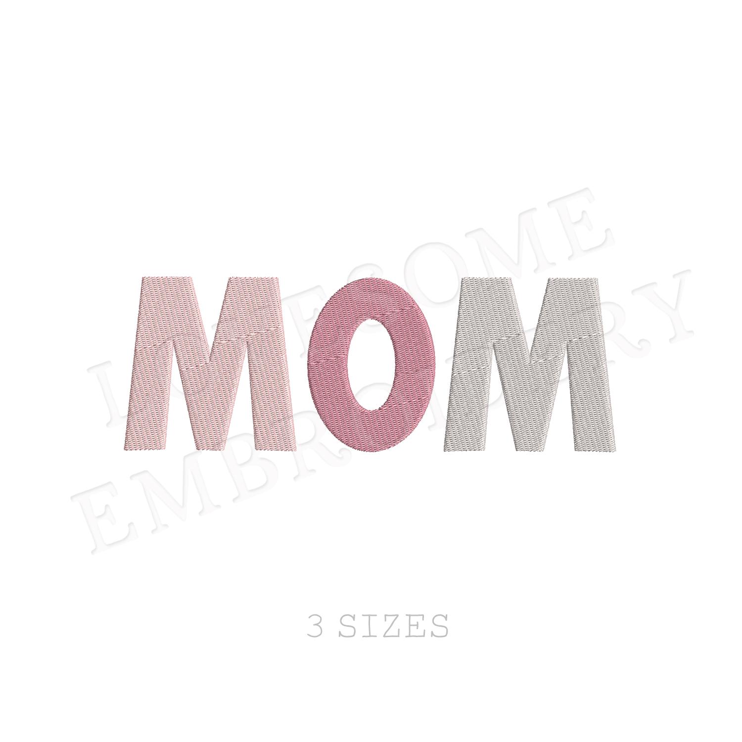 This listing features a machine embroidery file of word "MOM" in fill stitch in three sizes, 4inch, 5inch and 6inch.