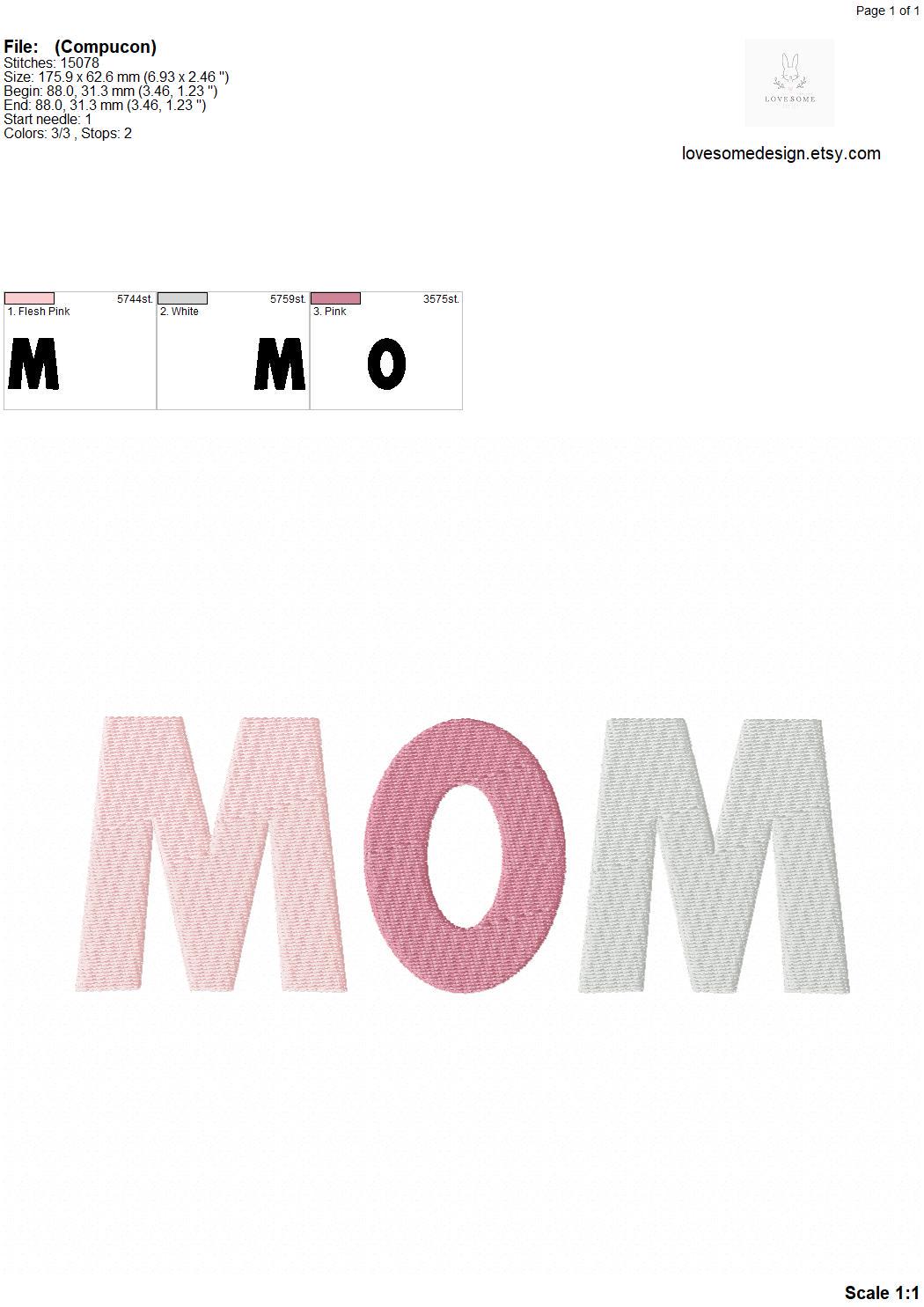 This listing features a machine embroidery file of word "MOM" in fill stitch in three big sizes, 7inch, 8inch and 10inch.