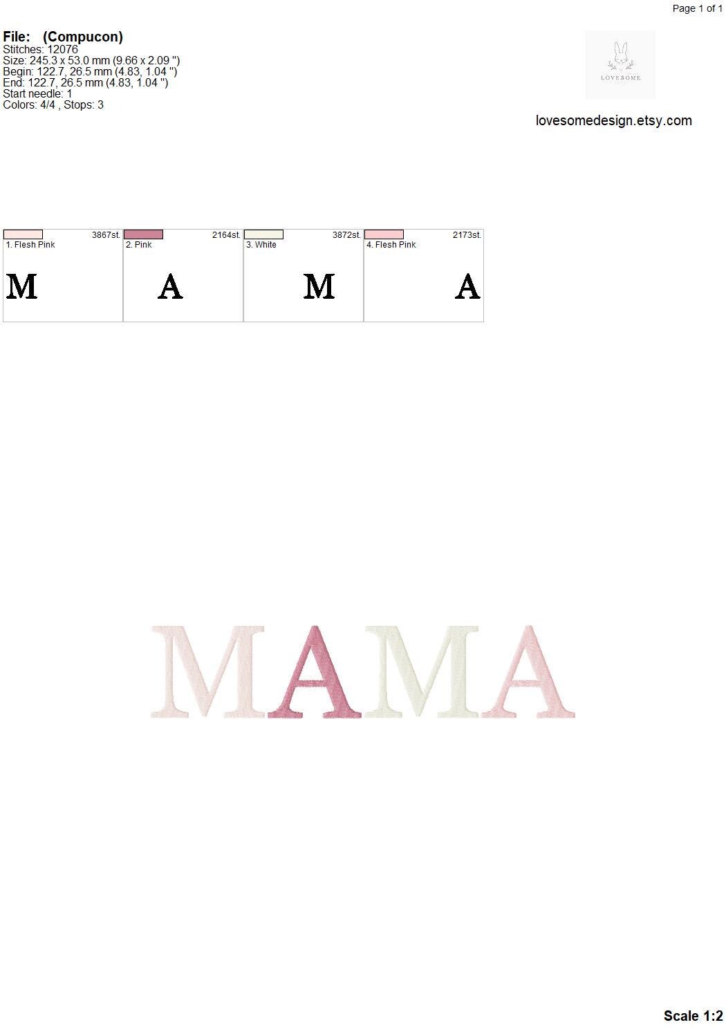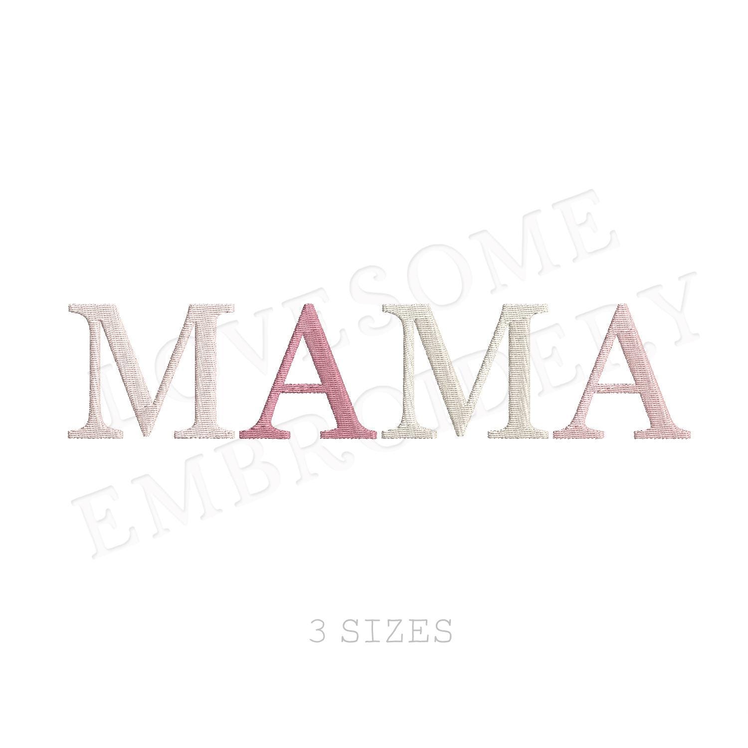 This listing features a machine embroidery file of word "MAMA" in fill stitch in three big sizes, 7inch, 8inch and 10inch.