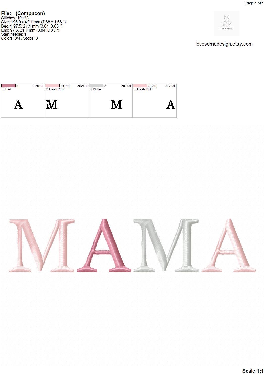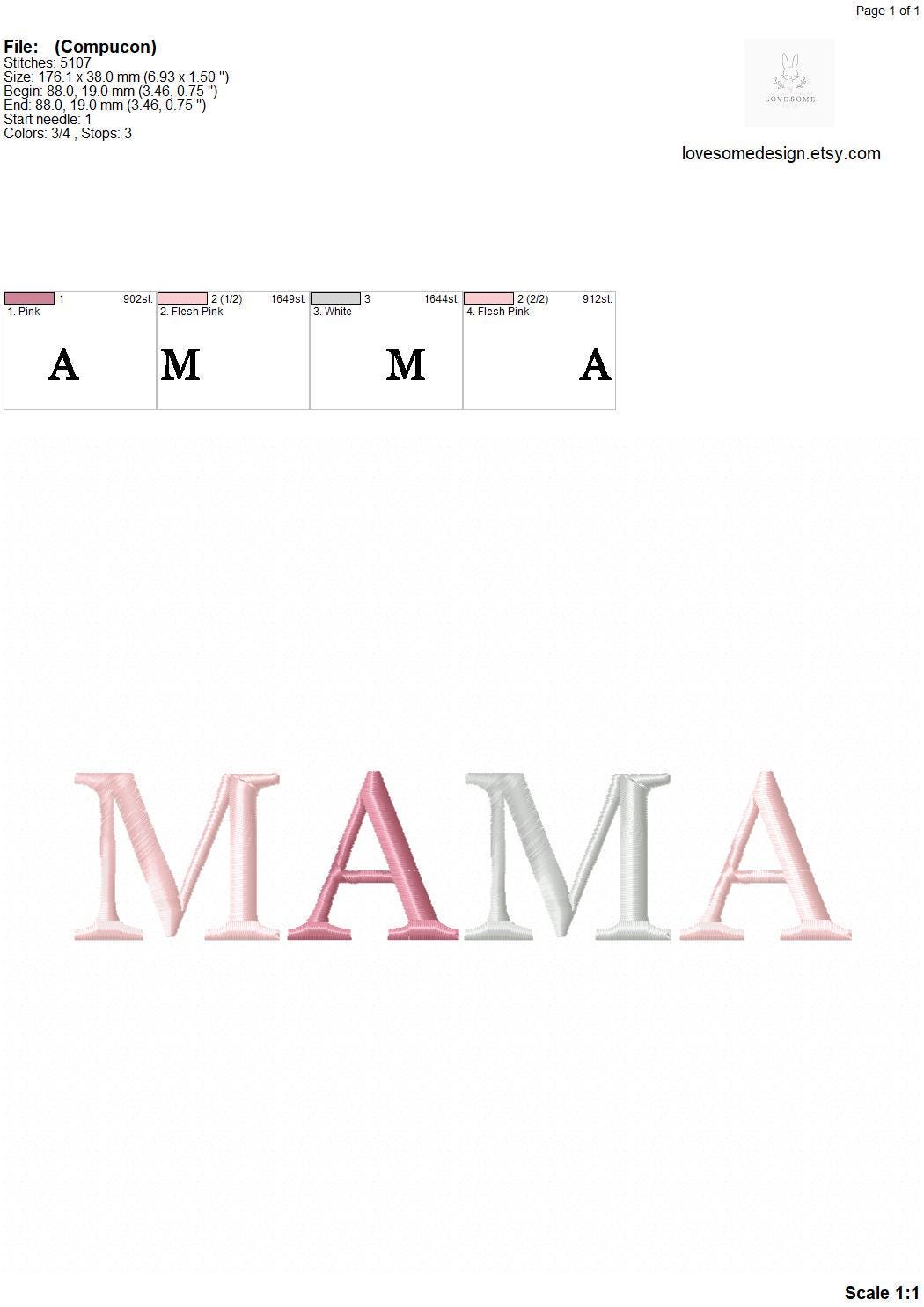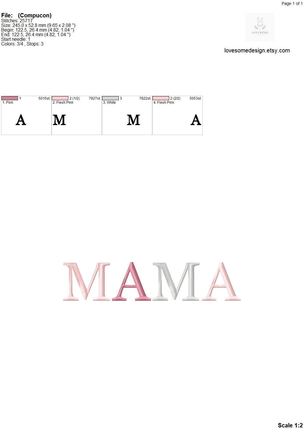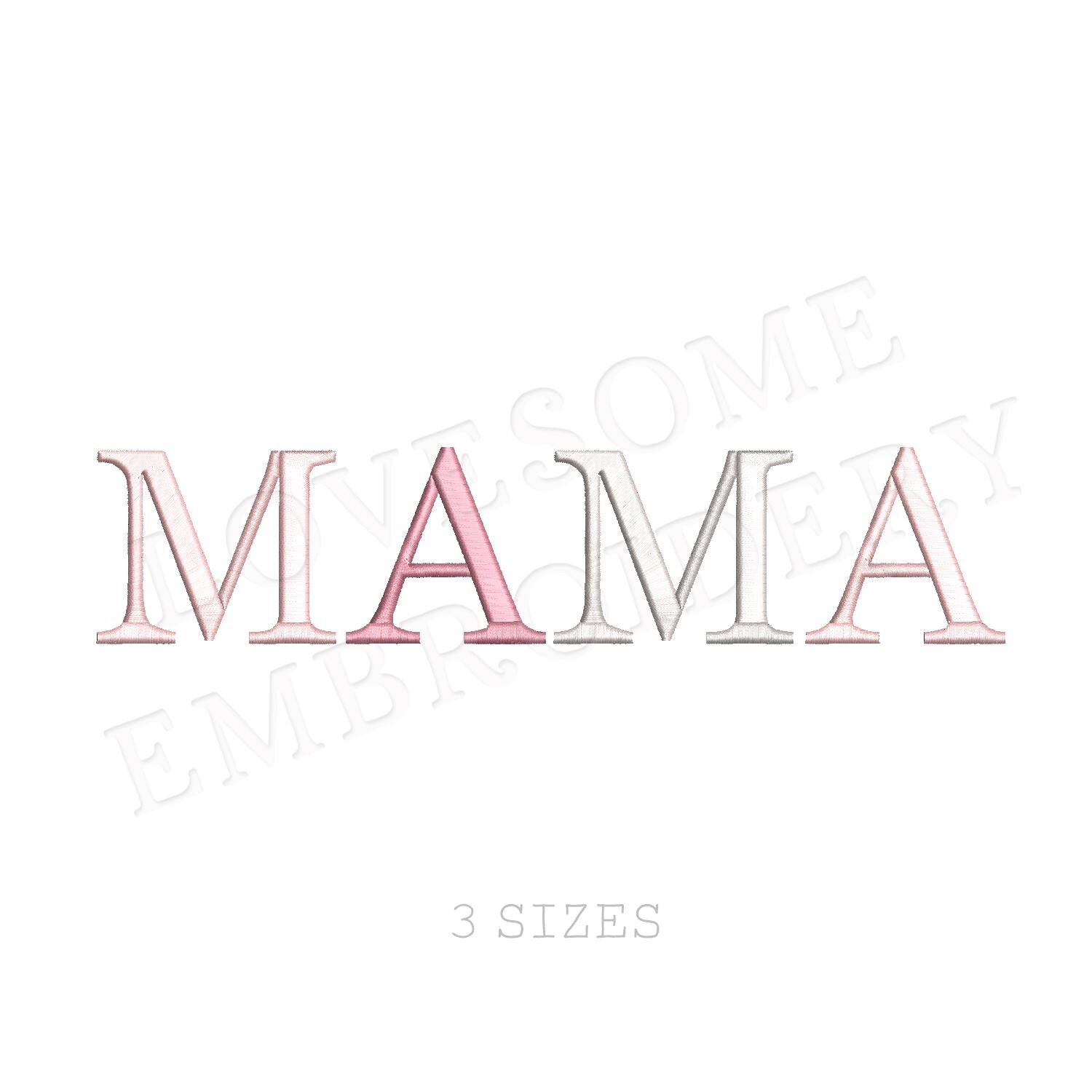 This listing features a machine embroidery file of word "MAMA" in satin stitch in three big sizes, 7inch, 8inch and 10inch.