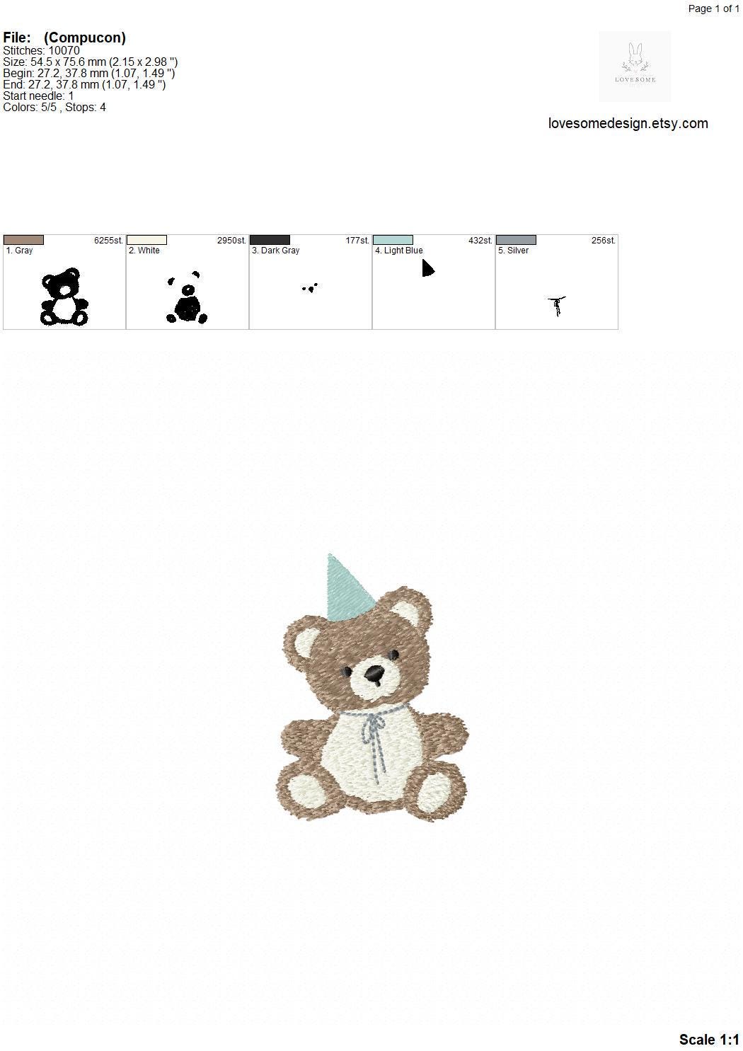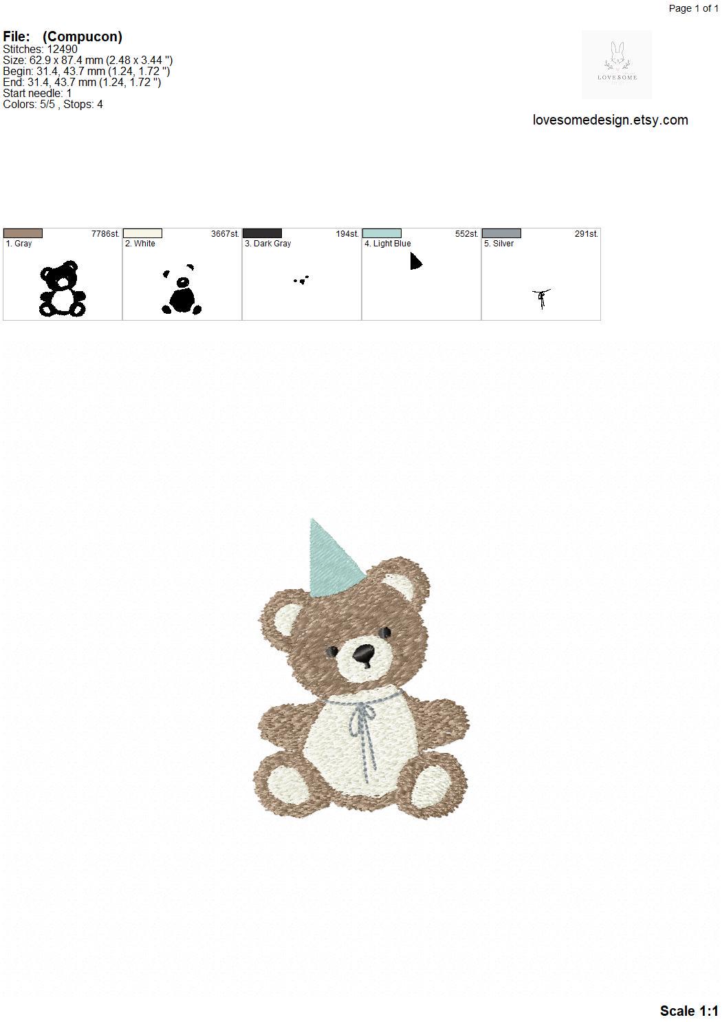 This listing includes one cute plush teddy design with a party hat for machine embroidery in two small sizes, each appr. in 3inch and 3.5inch size for embroidery hoops in different sizes.