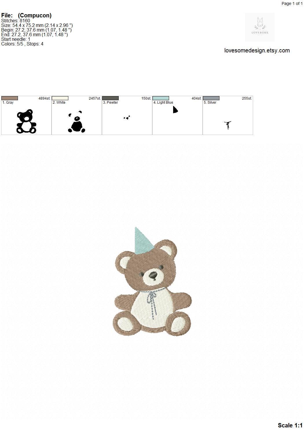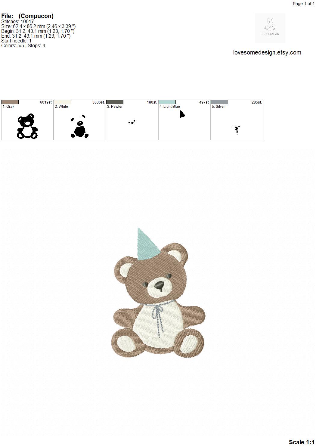 This listing includes one cute teddy bear design with a party hat for machine embroidery in two small sizes, each appr. in 3inch and 3.5inch size for embroidery hoops in different sizes.