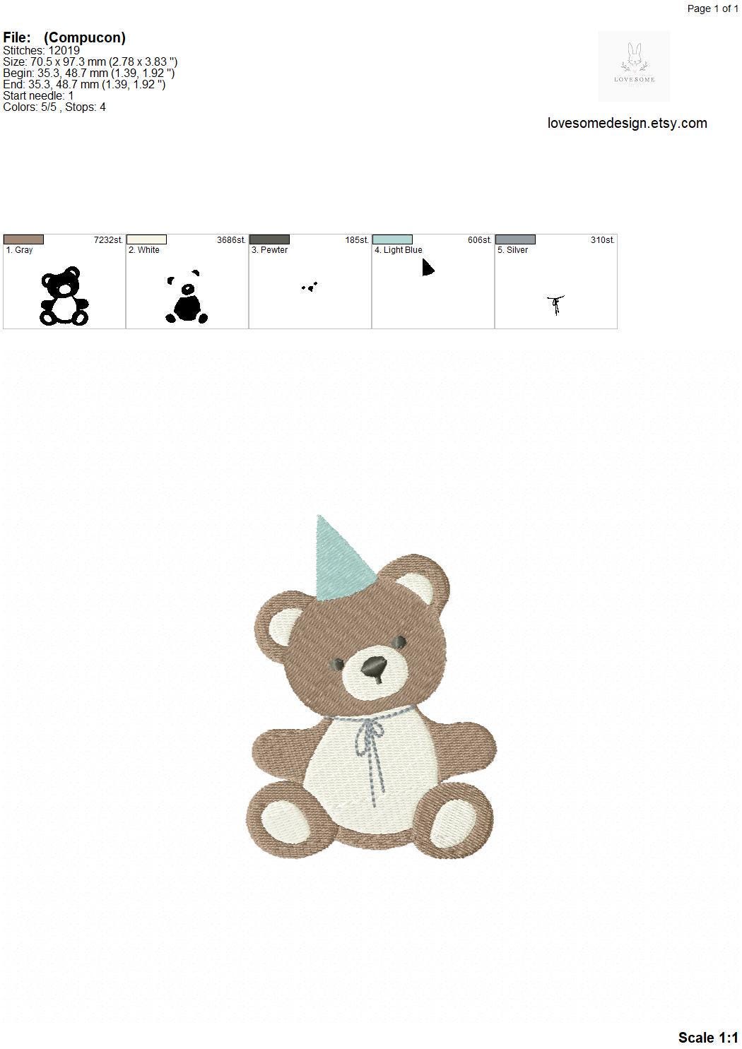 This listing includes one cute teddy bear design with a party hat for machine embroidery in two big sizes, each appr. in 4inch and 5inch size for embroidery hoops in different sizes.