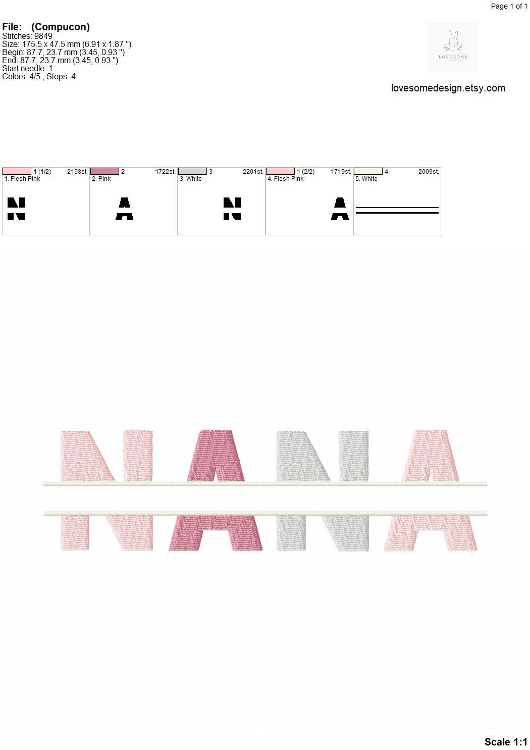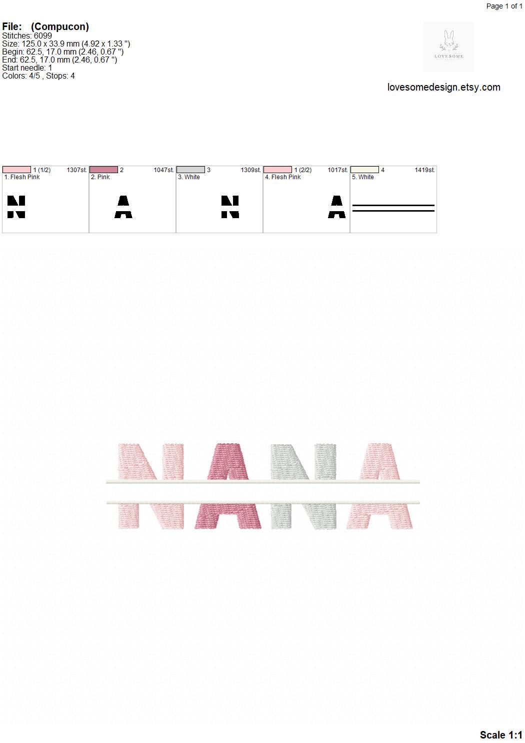 This listing features a machine embroidery file of word "NANA" with a split design in fill stitch in two sizes, 5inch and 7inch.