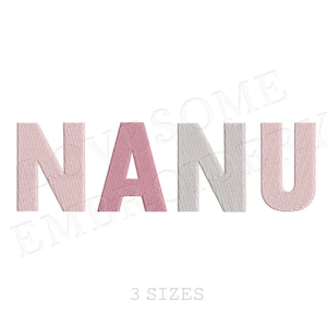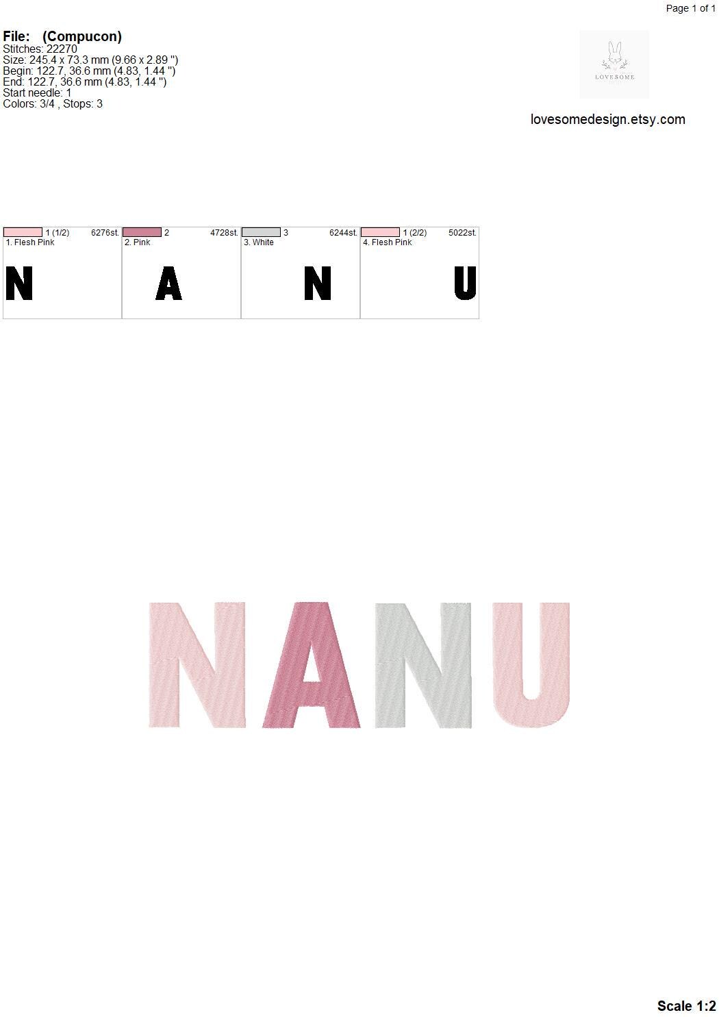 This listing features a machine embroidery file of word "NANU" in fill stitch in three big sizes, 7inch, 8inch and 10inch.