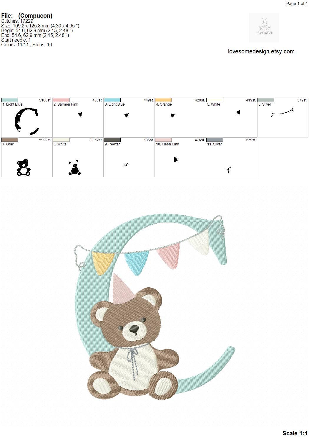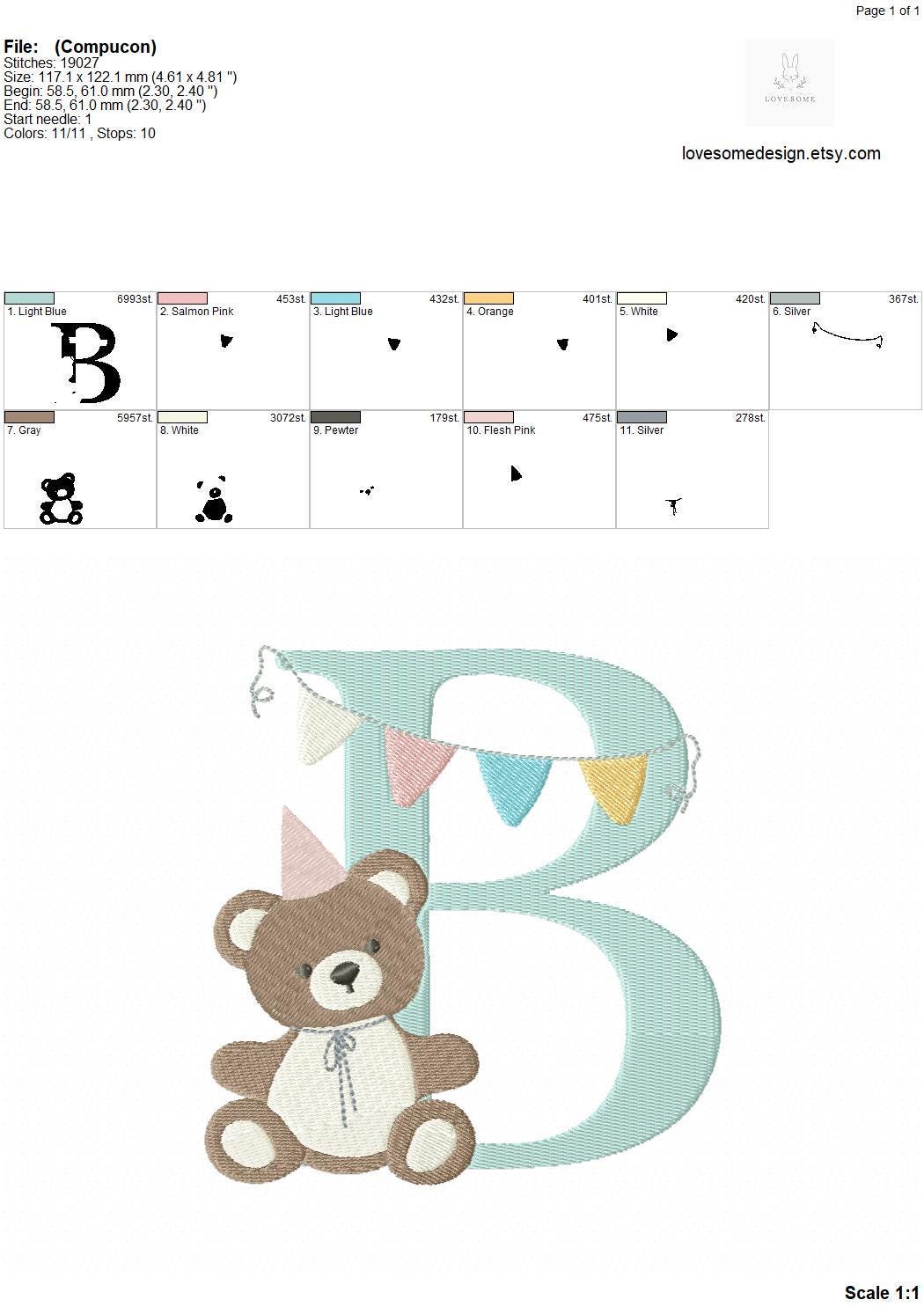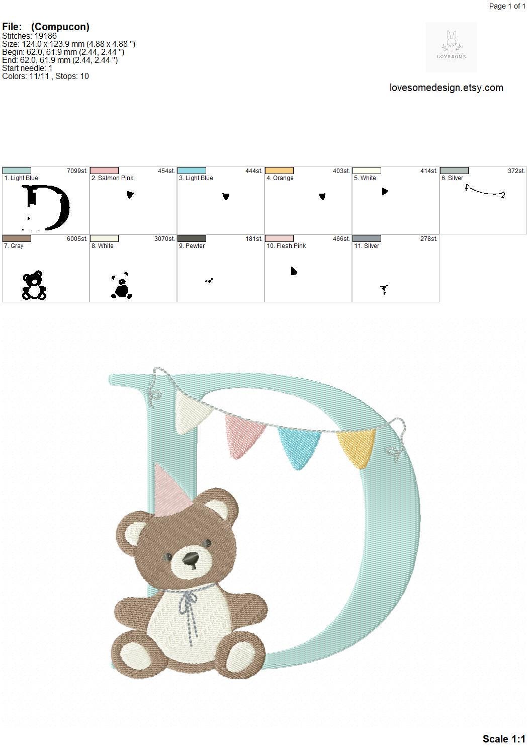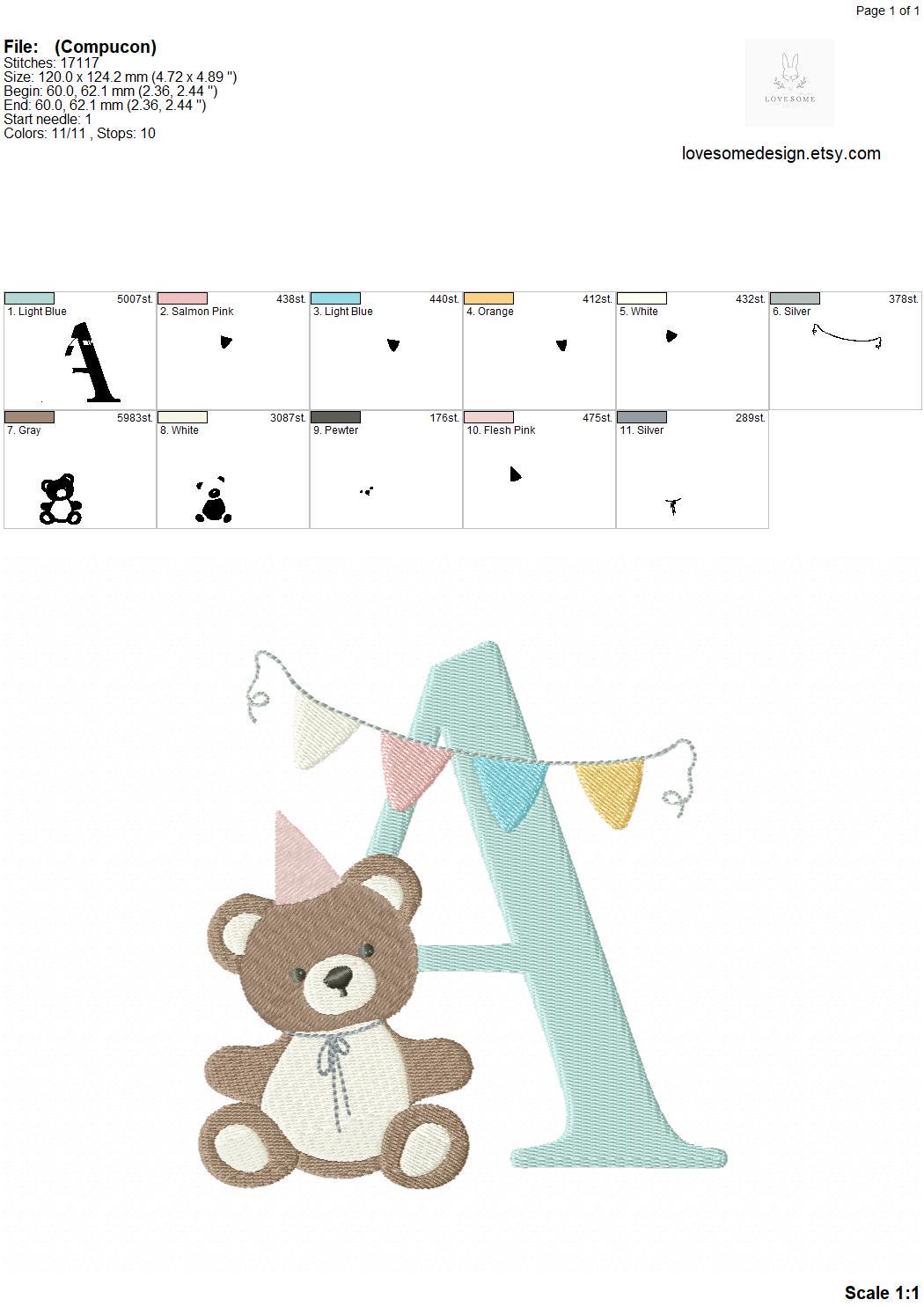 This listing features a machine embroidery font set which includes embroidery files of 26 uppercase monogram letters with cute teddy design with a party hat and bunting in 5inch size. (For the whole set, pls see the listing images.)