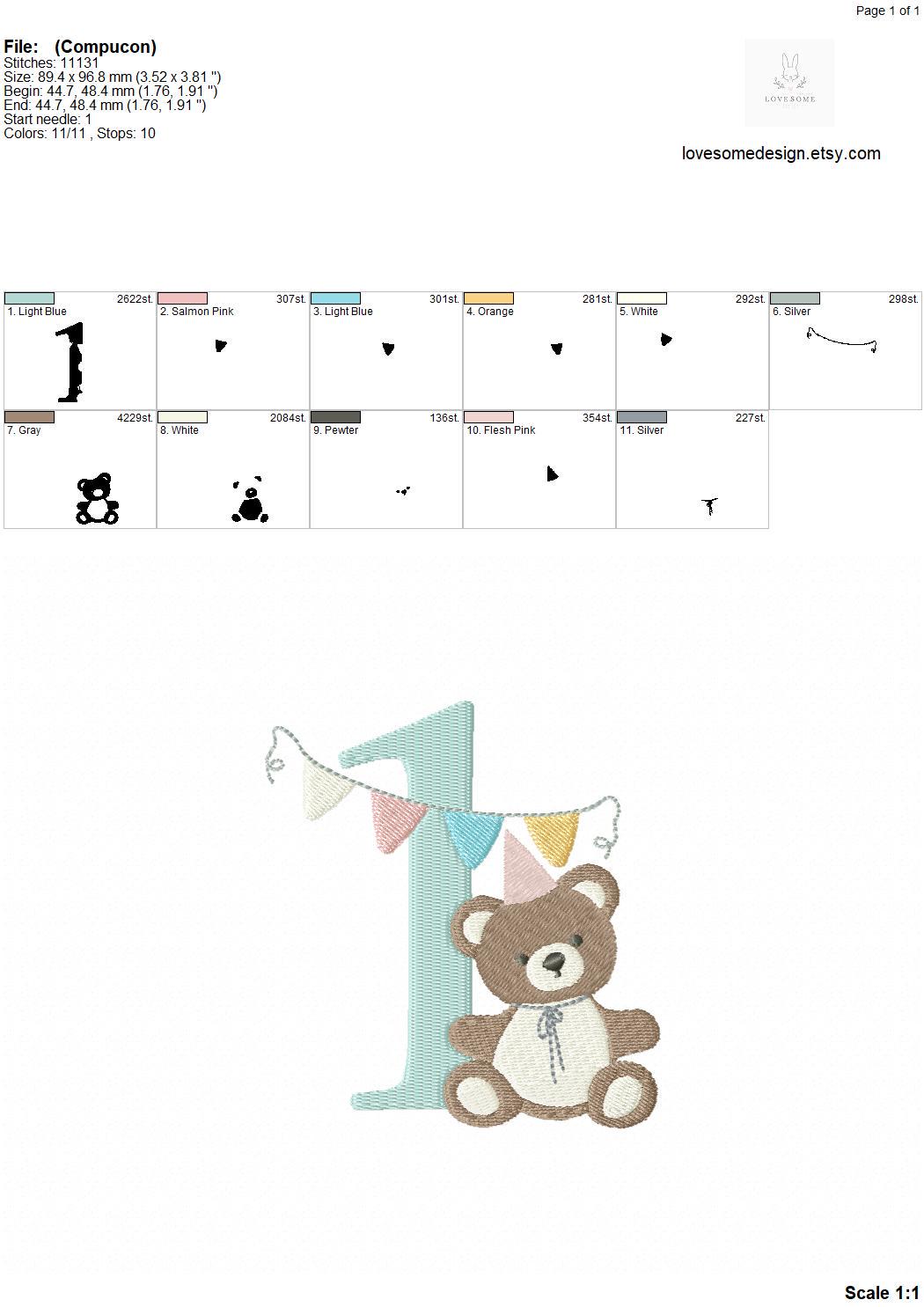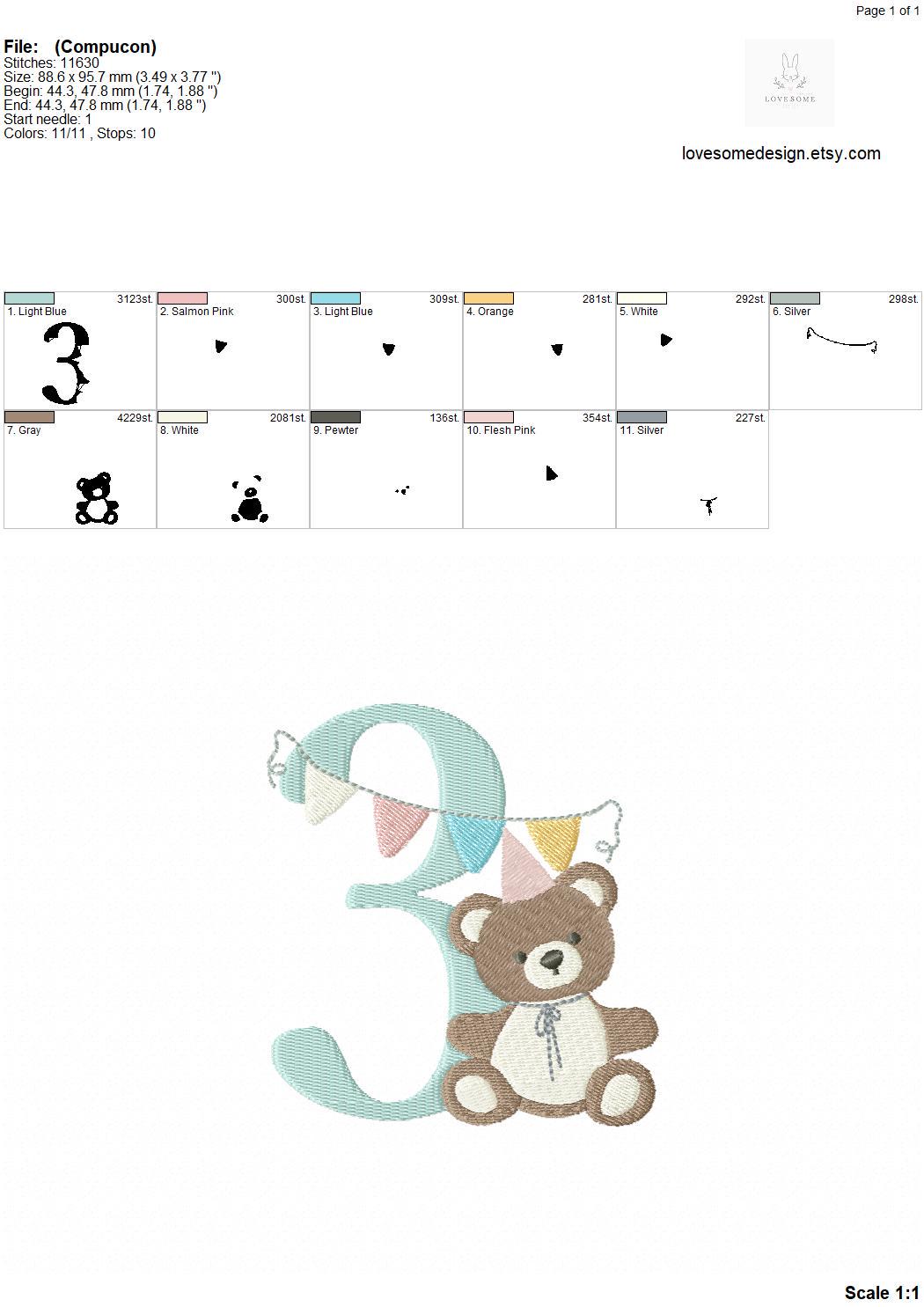 This listing features a machine embroidery numbers set which includes embroidery files of ten numbers (0-9) with cute teddy with a party hat design in one size for 4x4 hoops for machine embroidery. (For the whole set, pls see the listing images.)