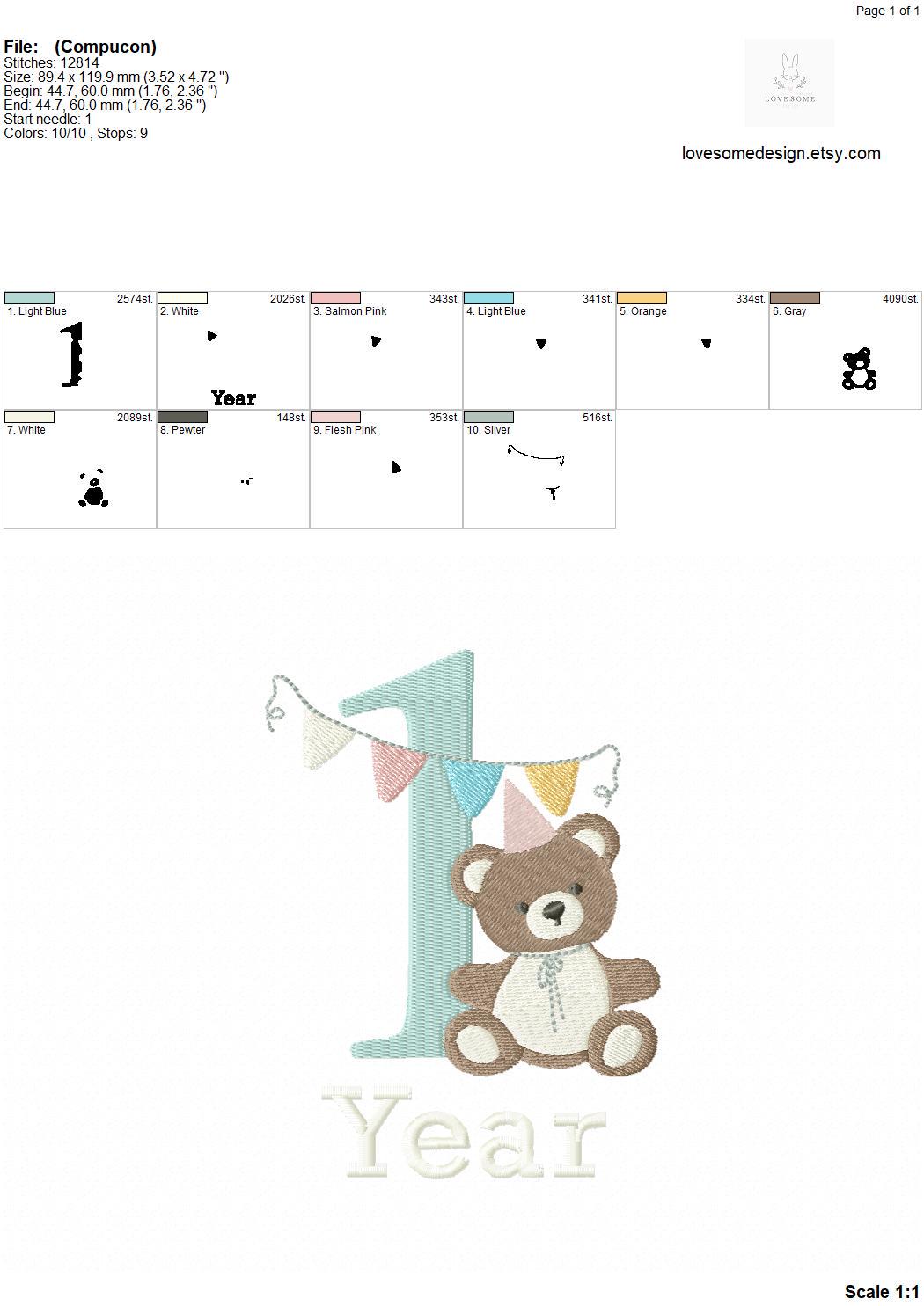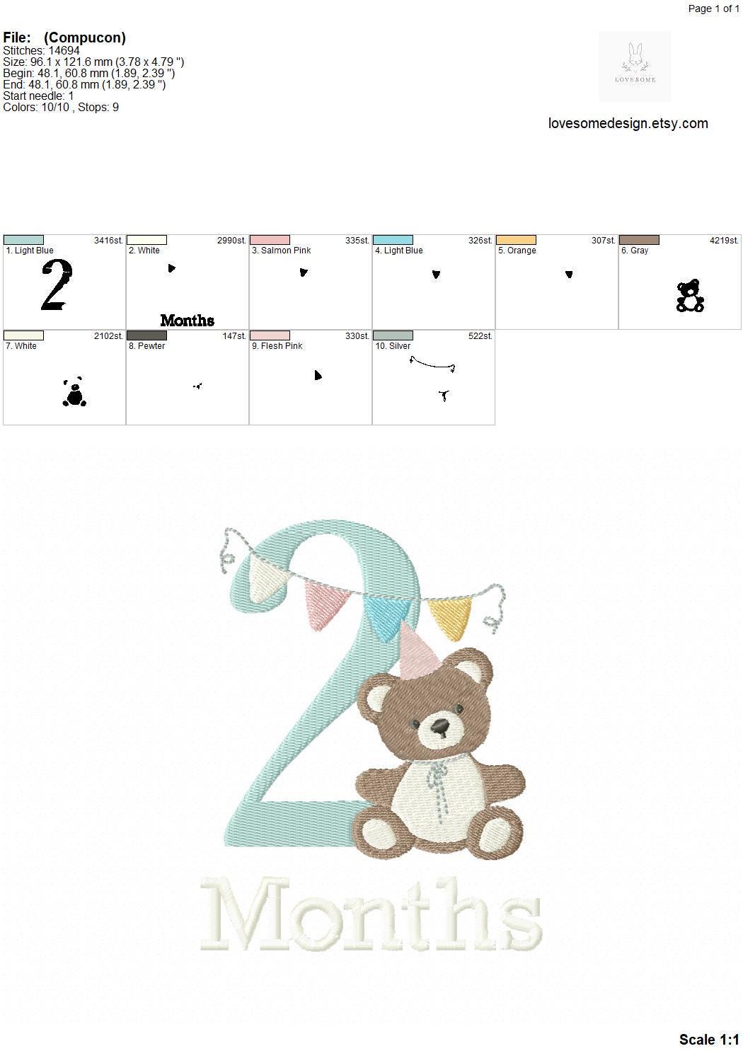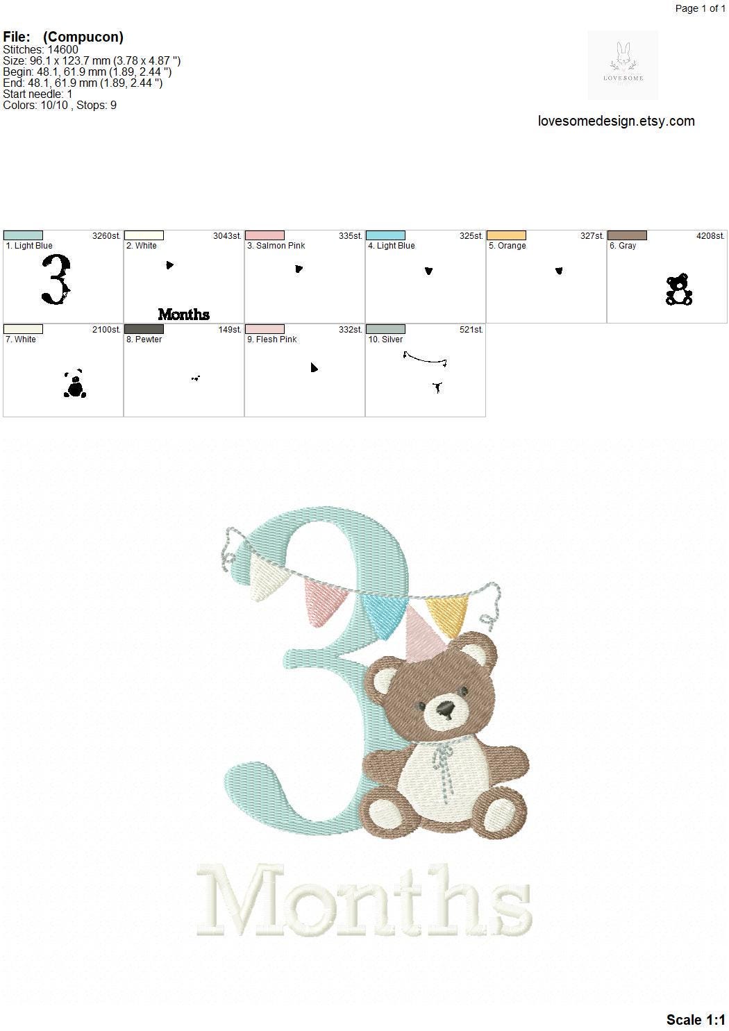 This listing includes number design set of cute teddy bear with a party hat and three letterings "Month", "Months" and "Year" in 4 inch size, can be stitched with two hoopings on 4x4 embroidery hoops. (For the whole set, pls see the listing images.)