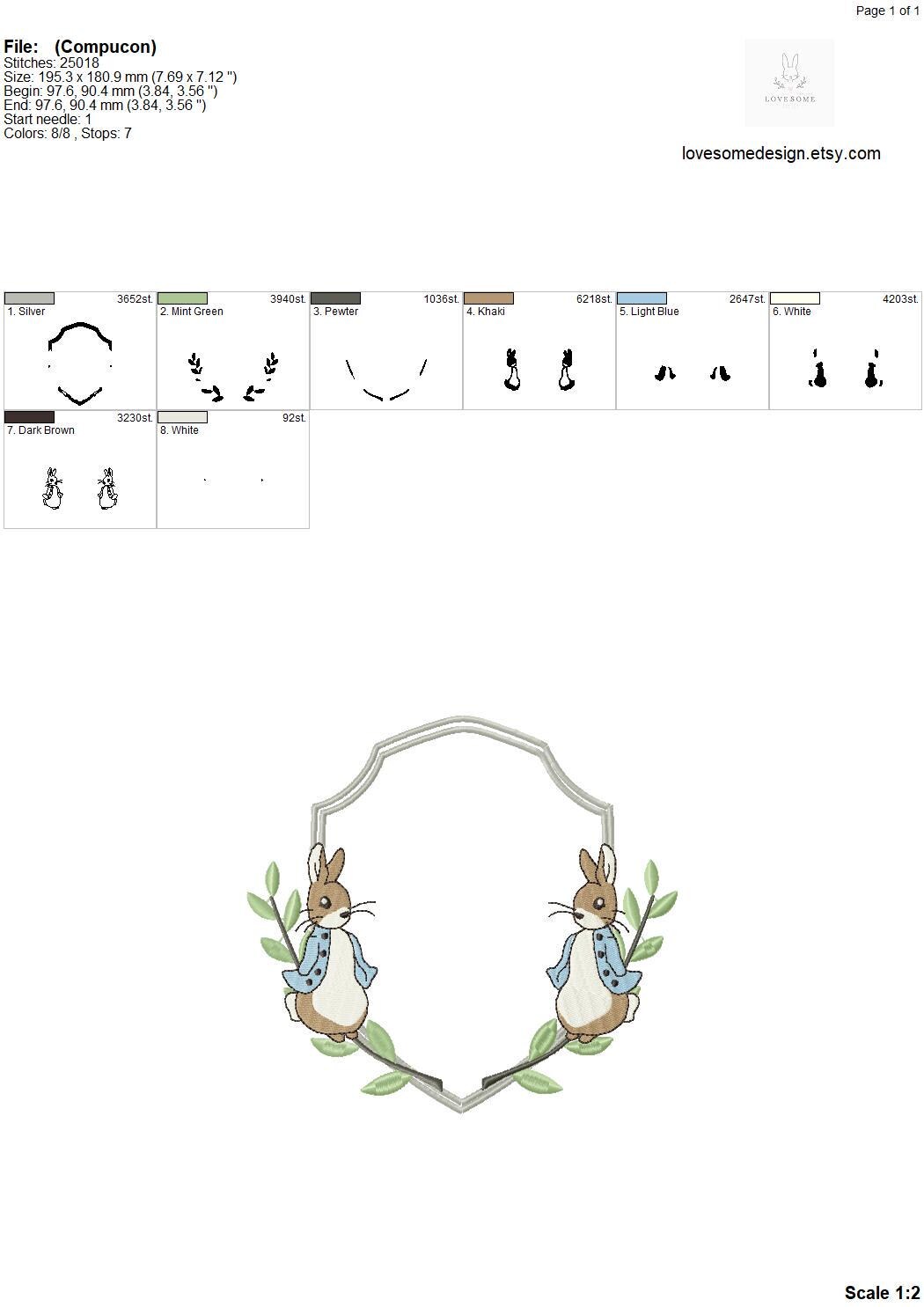 This listing features a machine embroidery file of Peter Rabbit crest design in appr. 8 inch size.