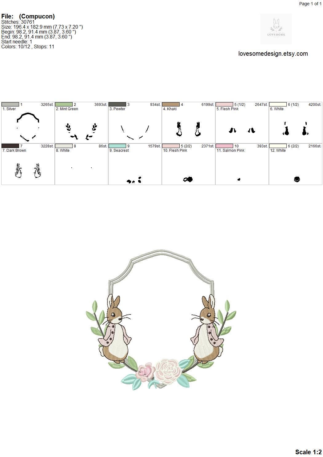 This listing features a machine embroidery file of floral Flopsy Rabbit floral crest design in 8 inch size.