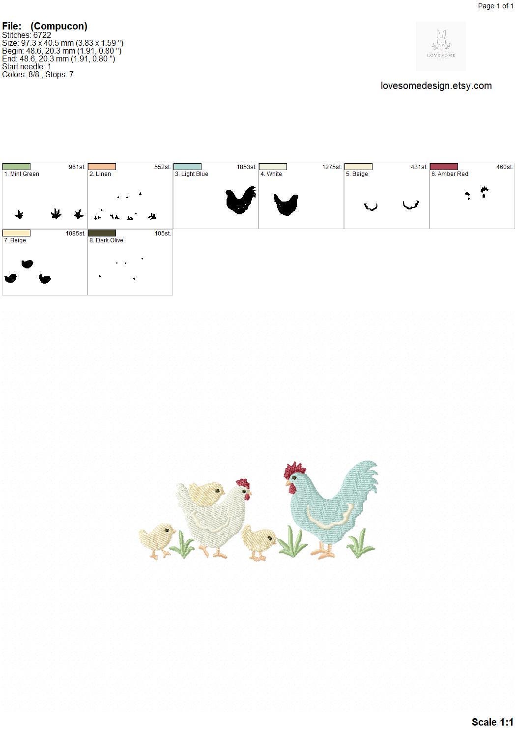 This listing includes one cute chicken family with three baby chicks design for machine embroidery in 4inch size.