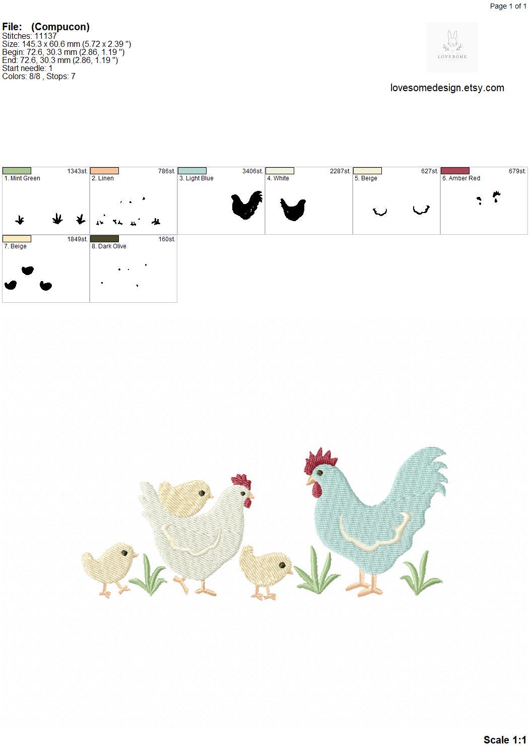 This listing includes one cute chicken family with three baby chicks design for machine embroidery in 6inch size.