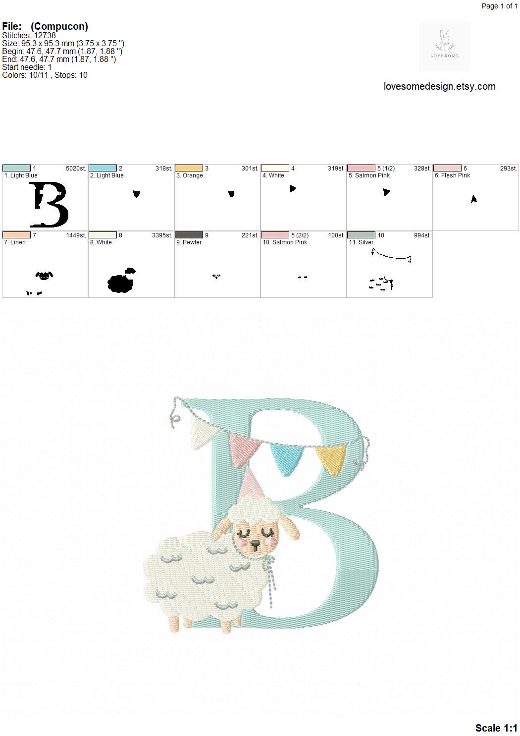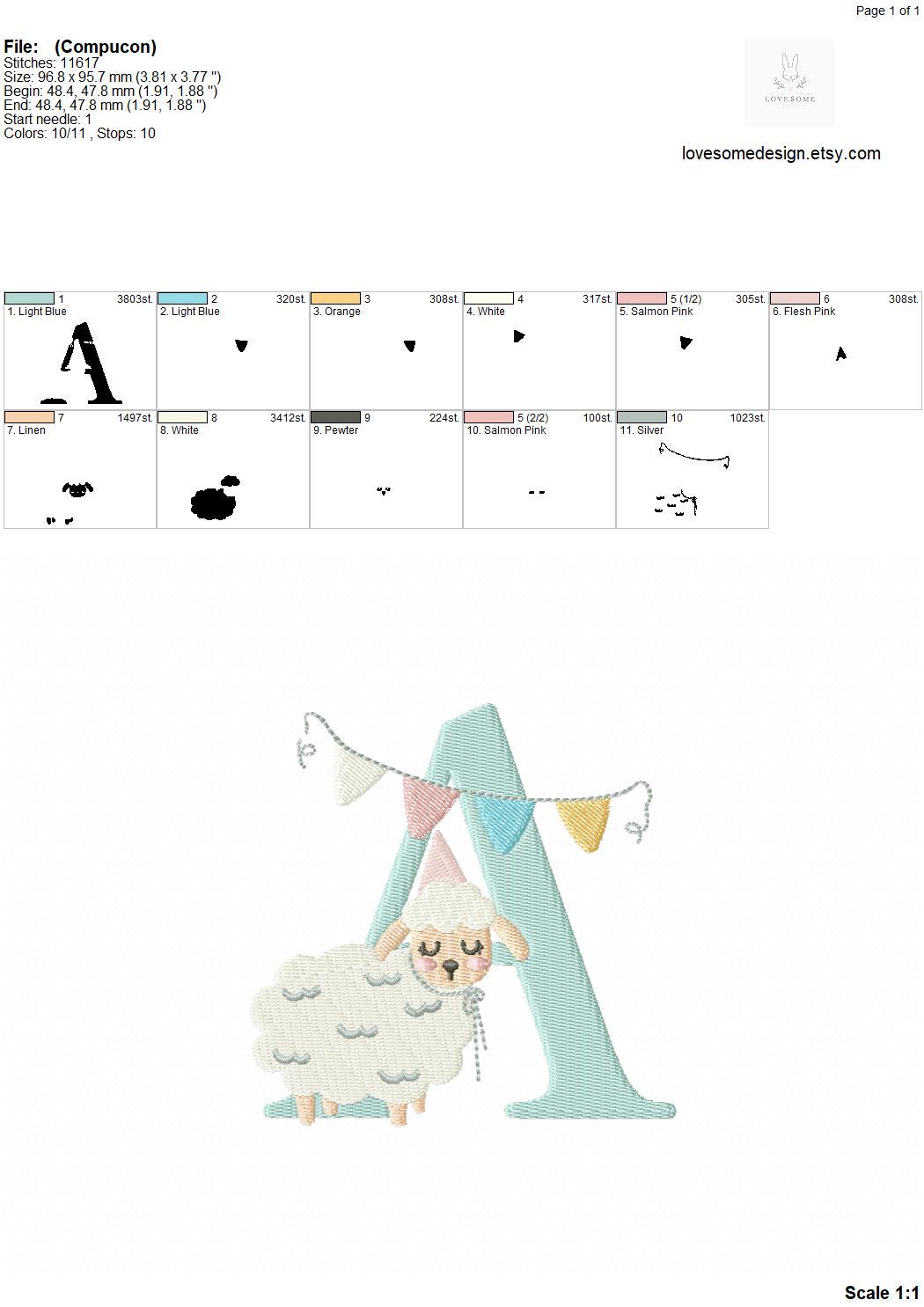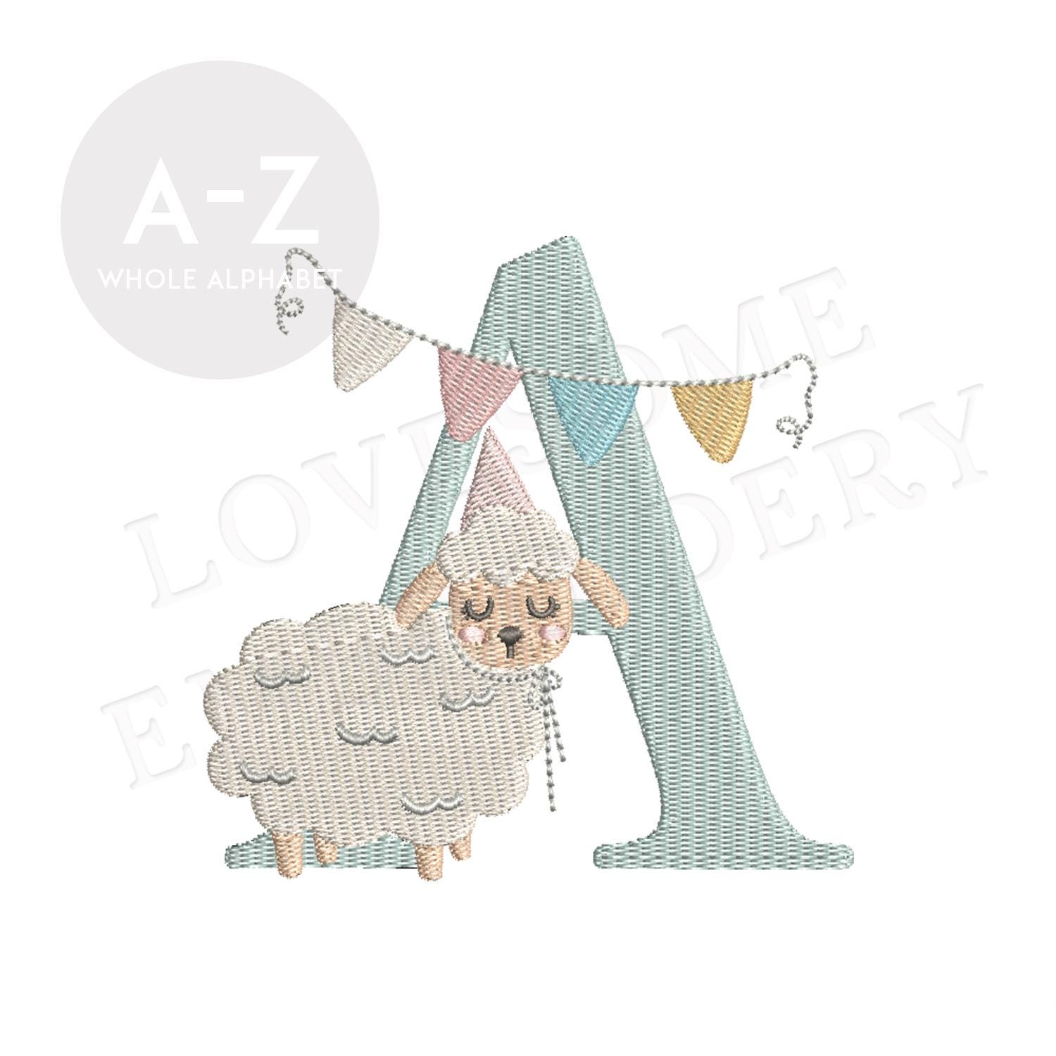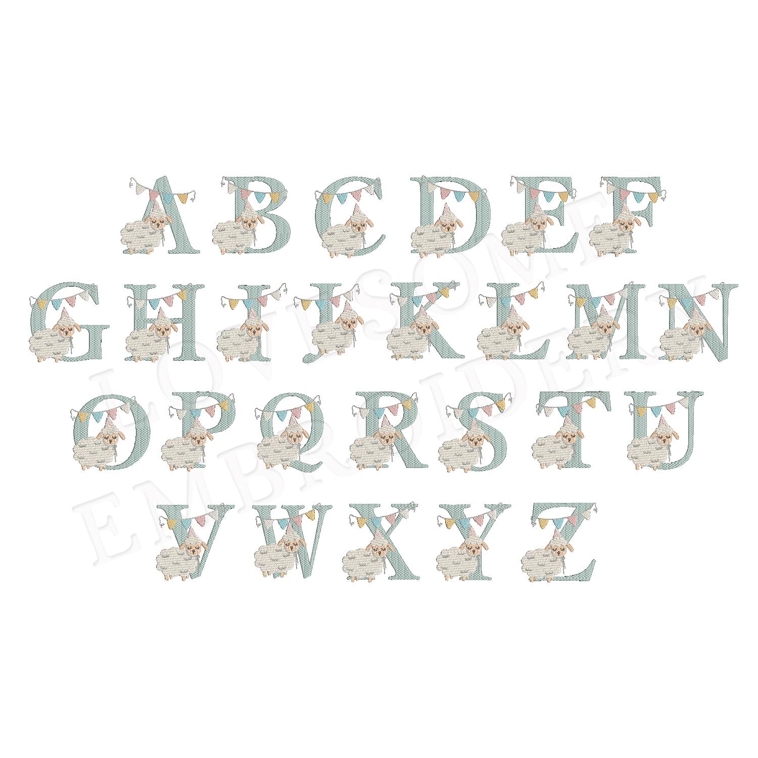 This listing features a machine embroidery font set which includes embroidery files of 26 uppercase monogram letters with a cute little birthday lamb with a party hat design in 4inch size. (For the whole set, pls see the listing images.)