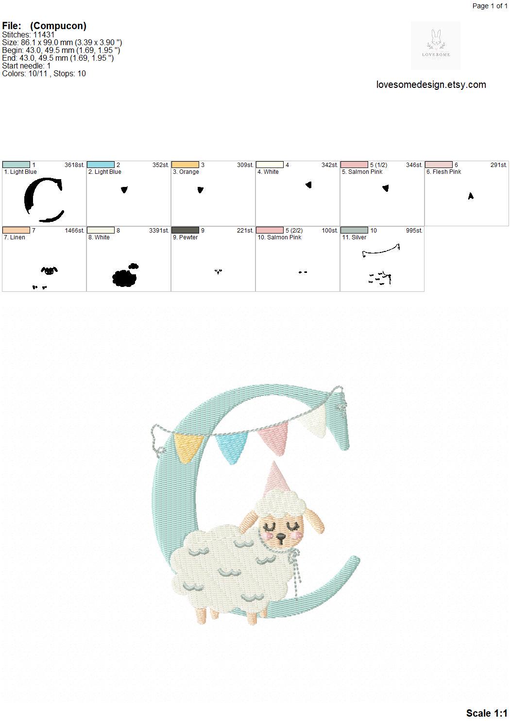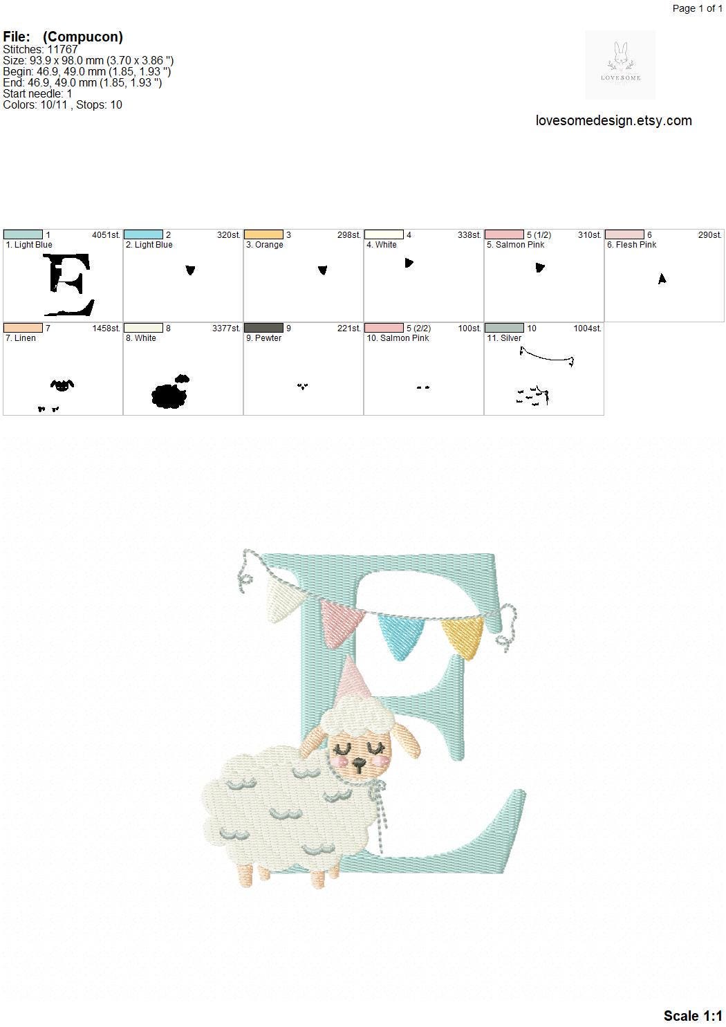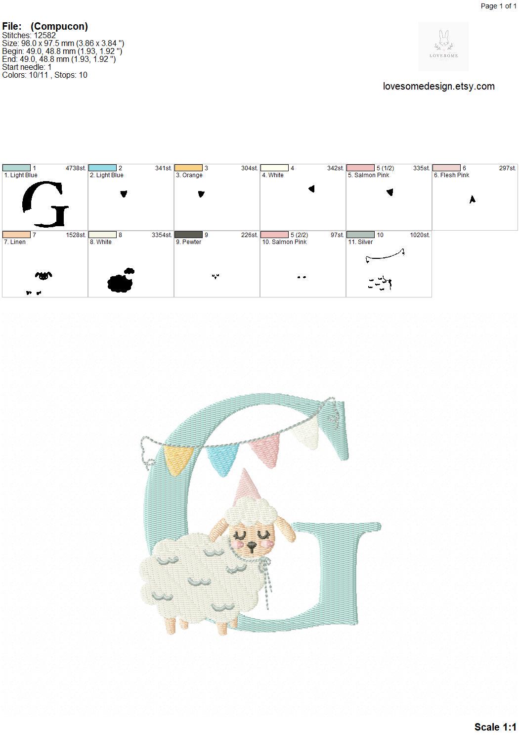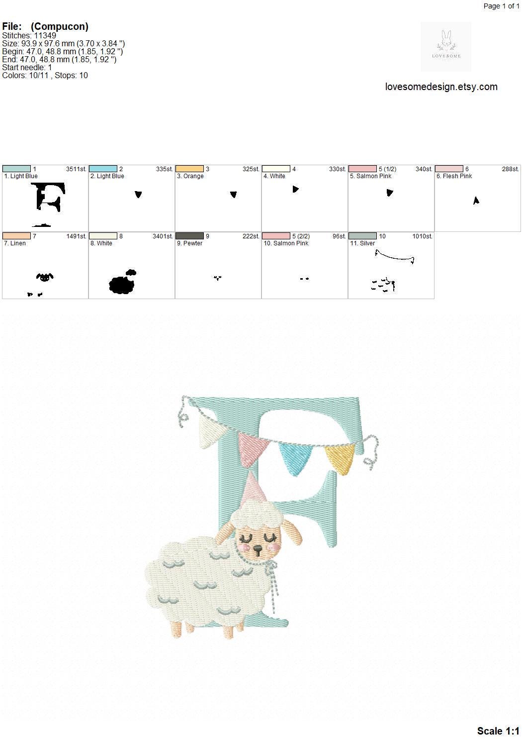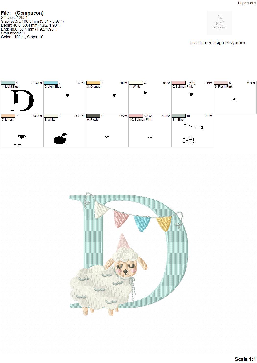 This listing features a machine embroidery font set which includes embroidery files of 26 uppercase monogram letters with a cute little birthday lamb with a party hat design in 4inch size. (For the whole set, pls see the listing images.)